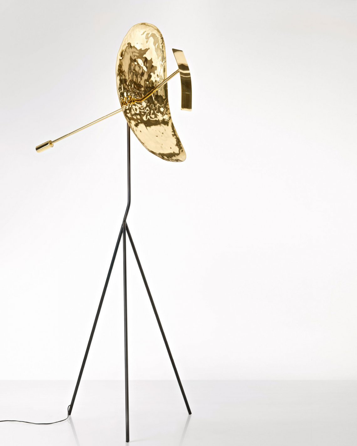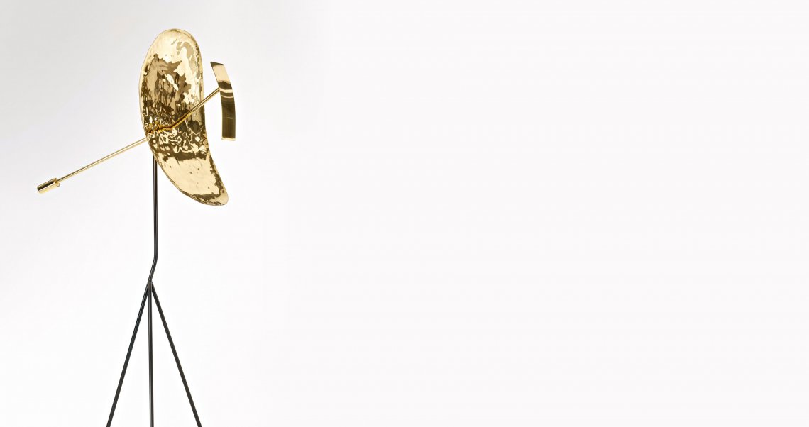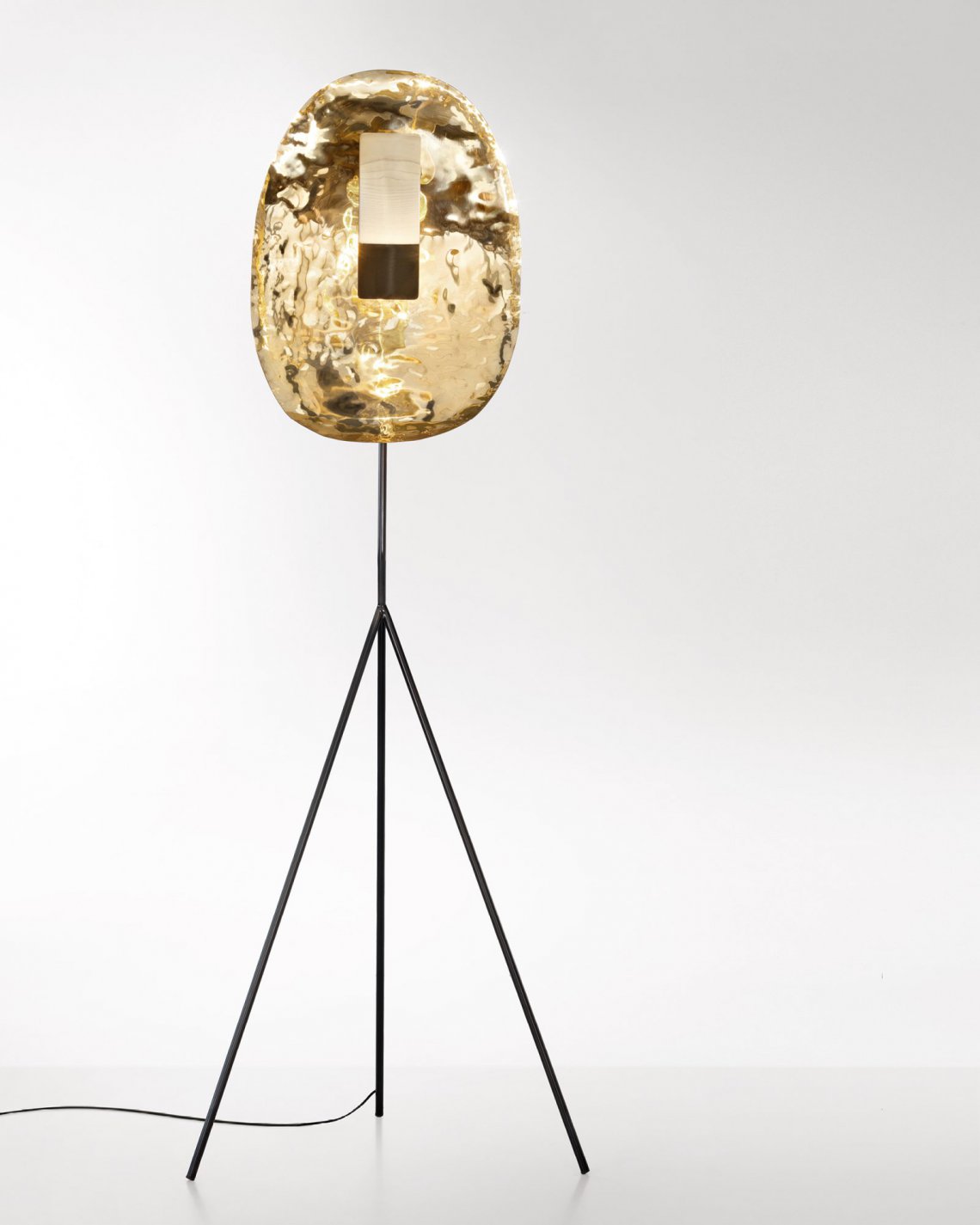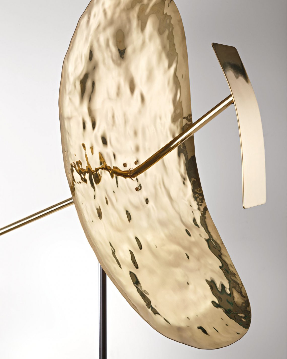 A flowing, sensible presence, delicately balanced. A sculptural object composed of a hand-hammered brass diffuser, metal that still seems to radiate the energy of the tool that shaped it. Light, originating from a LED source, is reflected as if it were liquid. Each reflection evokes the movement of water while the entire composition seems to vibrate brightly in space.