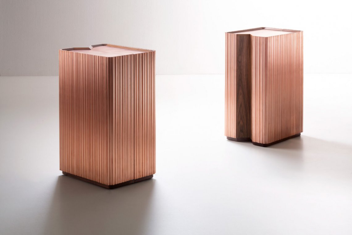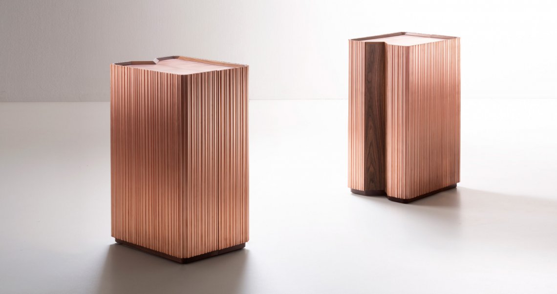 The bar, a much-loved place and symbol of sociability, enters the house, bringing with it emotions that epitomise the Italian lifestyle. Barista is a compact mobile bar with a sculptural volume, characterised by a ribbed effect comprising natural copper rods of differing diameters which create an irregular texture and give life to a soft play of light. The upper surface, also in natural copper, is slightly lower than the perimeter, thus making it useful for resting and serving drinks. The mobile bar opens like a book: the perfect 180° opening action is made possible by the design solution which incorporates a “V” shape, thus enabling the two symmetrical halves to align perfectly. The opening action is helped by two small wheels housed within the base. The interior is made entirely of stainless steel (this material was selected also because it’s hygienic and easy to clean) with a special mirrored finish, which multiplies the kaleidoscope of colours of the beverages and the reflections from the glass bottles and glasses, engendering an elegant atmosphere reminiscent of a club or café. Barista is equipped to hold bottles and glasses of different shapes and sizes.