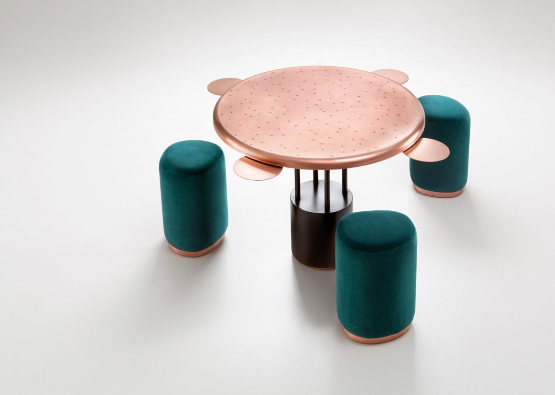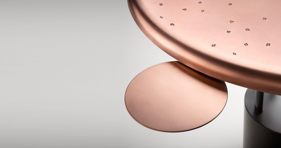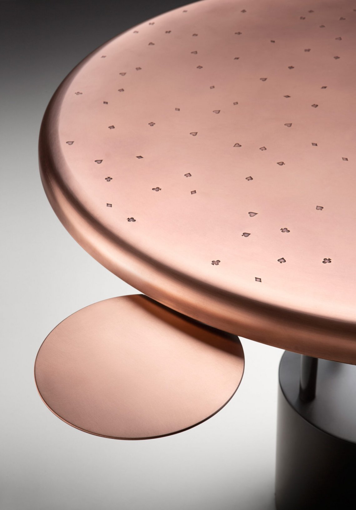 This games table is a throwback to yesteryear with a refined allure, which takes on a whole new value as we find ourselves with increased leisure time at home. The round table top in natural copper is characterised by the distinctive DeErosion finish, made even more special by the playful inclusion of the suits of the different playing cards. Four small serving trays can be extracted from beneath the table top when needed, for placing playing cards or a glass. The table is rounded off with four organically-shaped stools, featuring a copper base and seat with velvet upholstery.