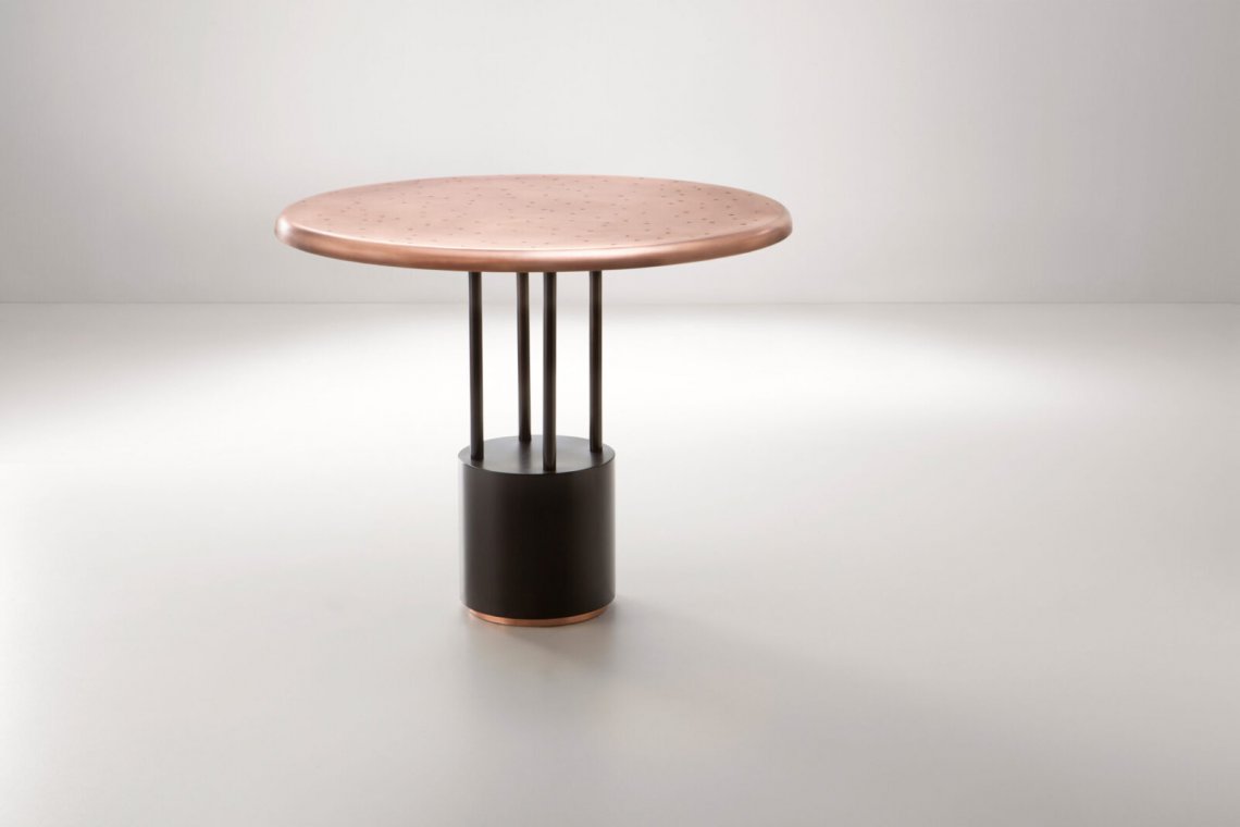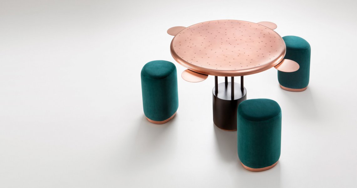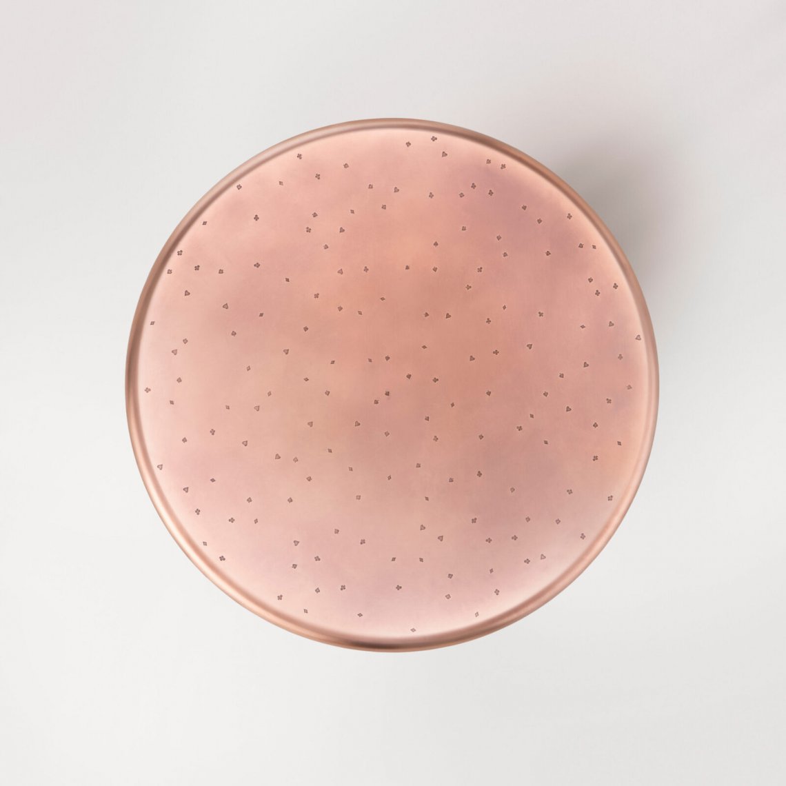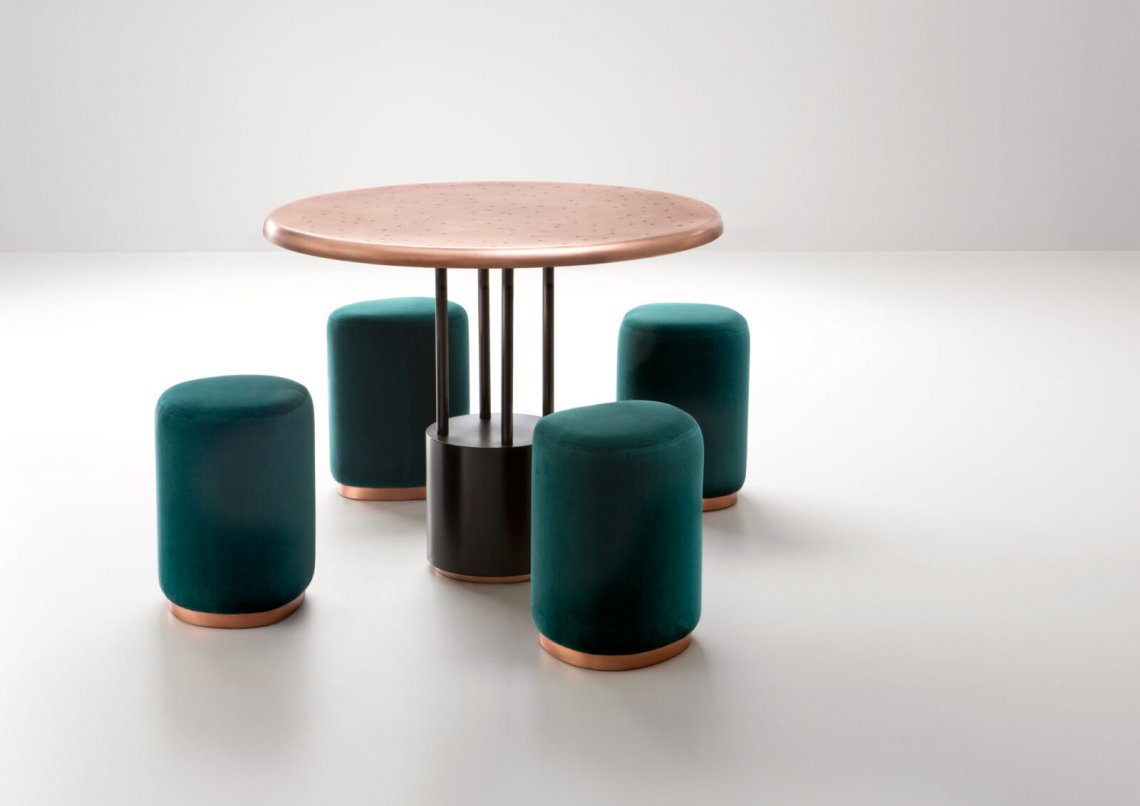 This games table is a throwback to yesteryear with a refined allure, which takes on a whole new value as we find ourselves with increased leisure time at home. The round table top in natural copper is characterised by the distinctive DeErosion finish, made even more special by the playful inclusion of the suits of the different playing cards. Four small serving trays can be extracted from beneath the table top when needed, for placing playing cards or a glass. The table is rounded off with four organically-shaped stools, featuring a copper base and seat with velvet upholstery.