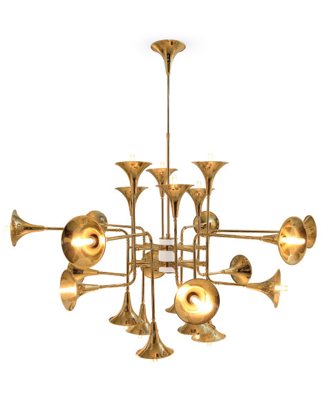 Botti modern chandelier instantly takes us into a music concert starring Chris Botti. The mid-century lighting design was inspired by the American trumpet player as a tribute to jazz music. With a structure handmade in brass and boasting a sophisticated gold-plated finish, this modern ceiling light showcases the high-quality craftsmanship for which DelightFULL is best known for. The brass chandelier goes as tall as 31,5 inches and uses 24 E27 bulbs, which are ingeniously placed at the end of the shades. Its unique shape and design make it the perfect hanging lamp to display on a mid-century modern living room, or a sophisticated hotel lobby.