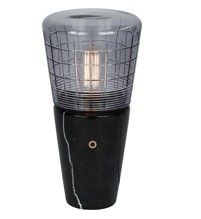 The Blender table lamp has an industrial and masculine look. It is made of black smooth marble and smoked faceted glass.