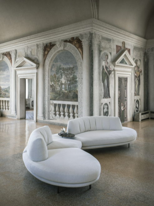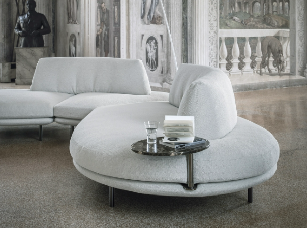 Elies is characterized by soft and sinuous shapes, curved and enveloping lines that convey simplicity and elegance. Distinguished by the combination of two modules with large-sized seats and a roll-up backrest, Elies is an organic sofa, which thrives on maximum modularity and its recomposition over time.Featuring a fully-removable cover, it is available in leather or fabric with an optional side table in various finishes.The floating seating in different organic forms is the result of investigating several combinations for different composition opportunities. The innovative, extremely supple backrest that takes on different sinuous shapes is feather filled with a polyurethane insert.