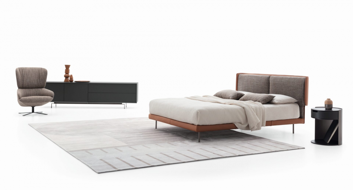 L’accogliente testiera si traduce in un sobrio abbraccio per un letto contenuto nelle dimensioni di ingombro. Il carattere leggero ed essenziale diventa il segno distintivo di Skin.