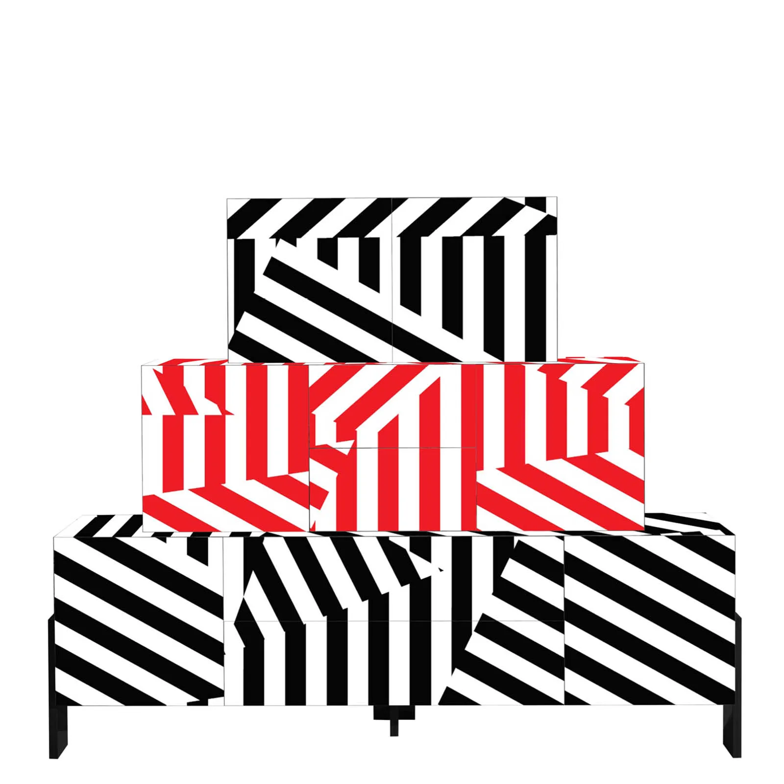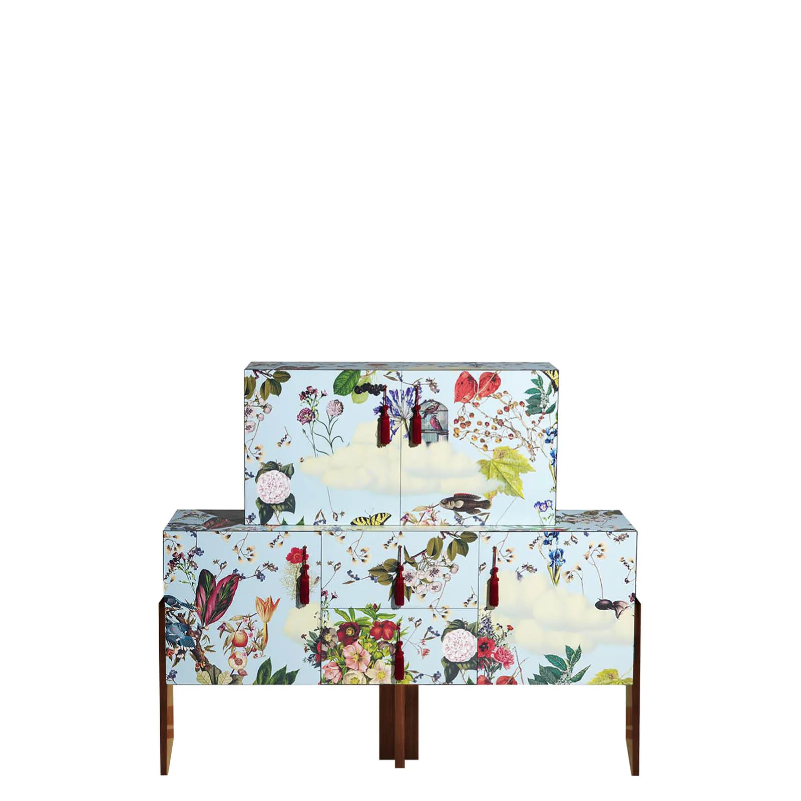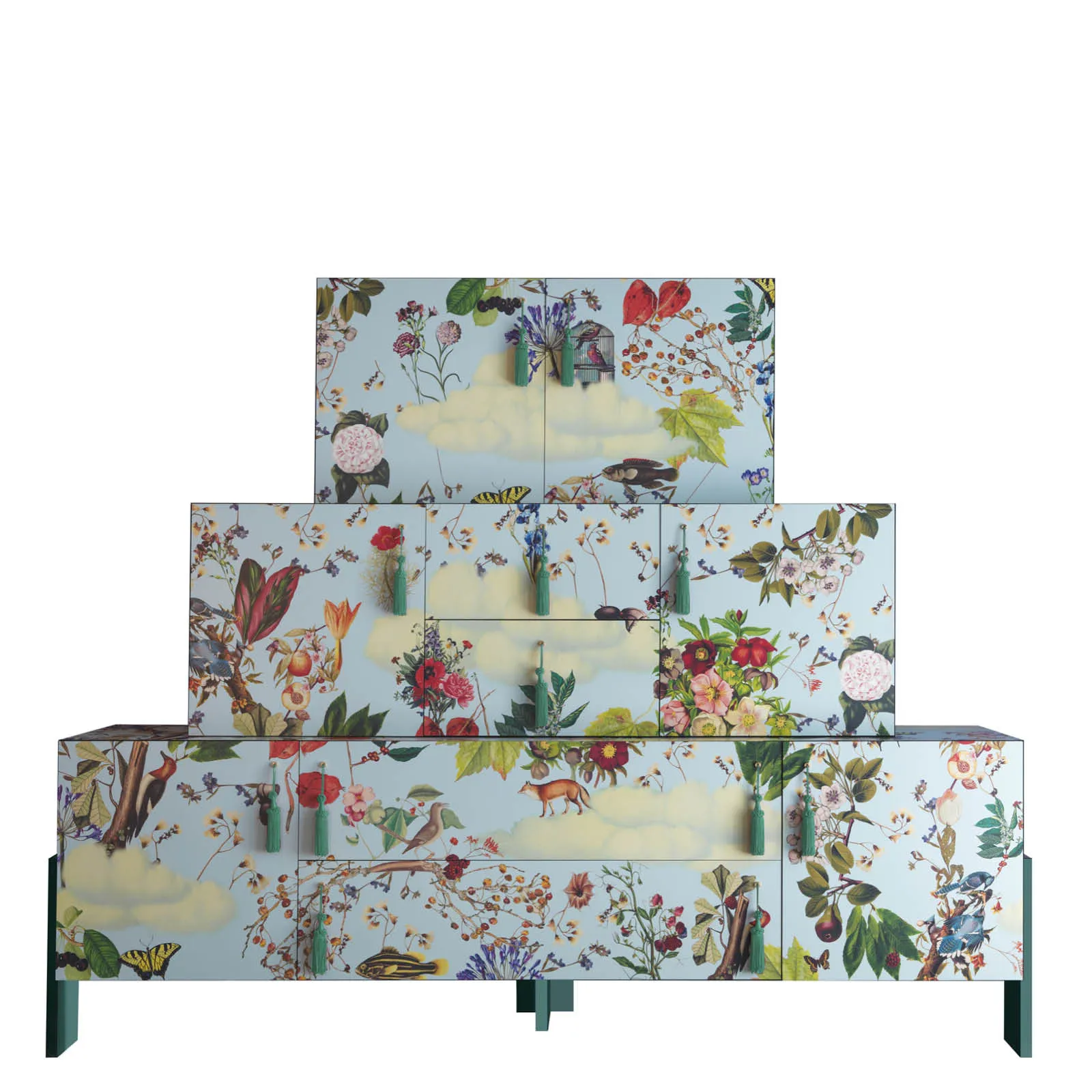 Nel 2020 Driade, il laboratorio estetico per eccellenza, propone un ampliamento della collezione Ziqqurat negli iconici pattern: romantico nella versione floreale con nappine o pop nella versione geometrica bianca e nera con maniglia nera. La collezione si arricchisce quindi di nuovi pezzi ‘must have’ che vanno ad aggiungersi al contenitore componibile a tre altezze e a quello verticale: contenitore small e contenitore extra small pensati per uno spazio dell’abitare e stile di vita contemporanei. Inoltre i classici Ziqqurat vengono proposti nel pattern floreale abbinato alla nuova finitura laccato ottanio per le gambe, con nappa ottanio.