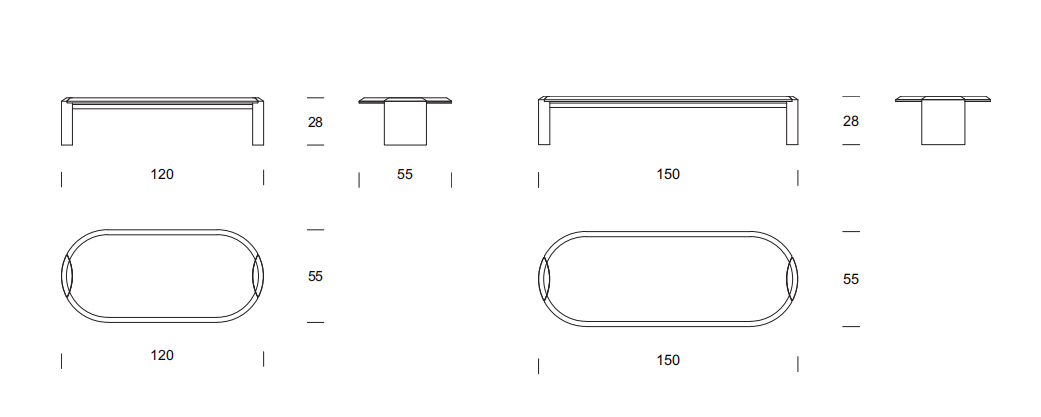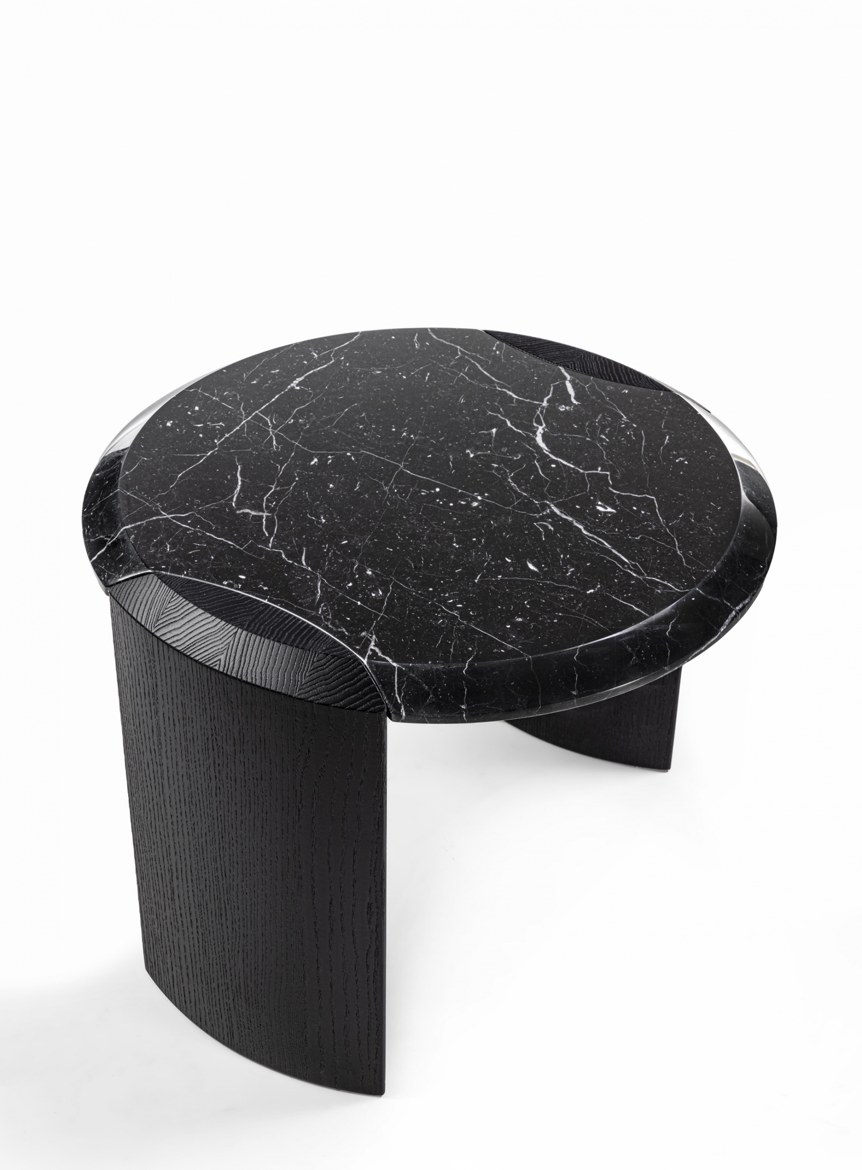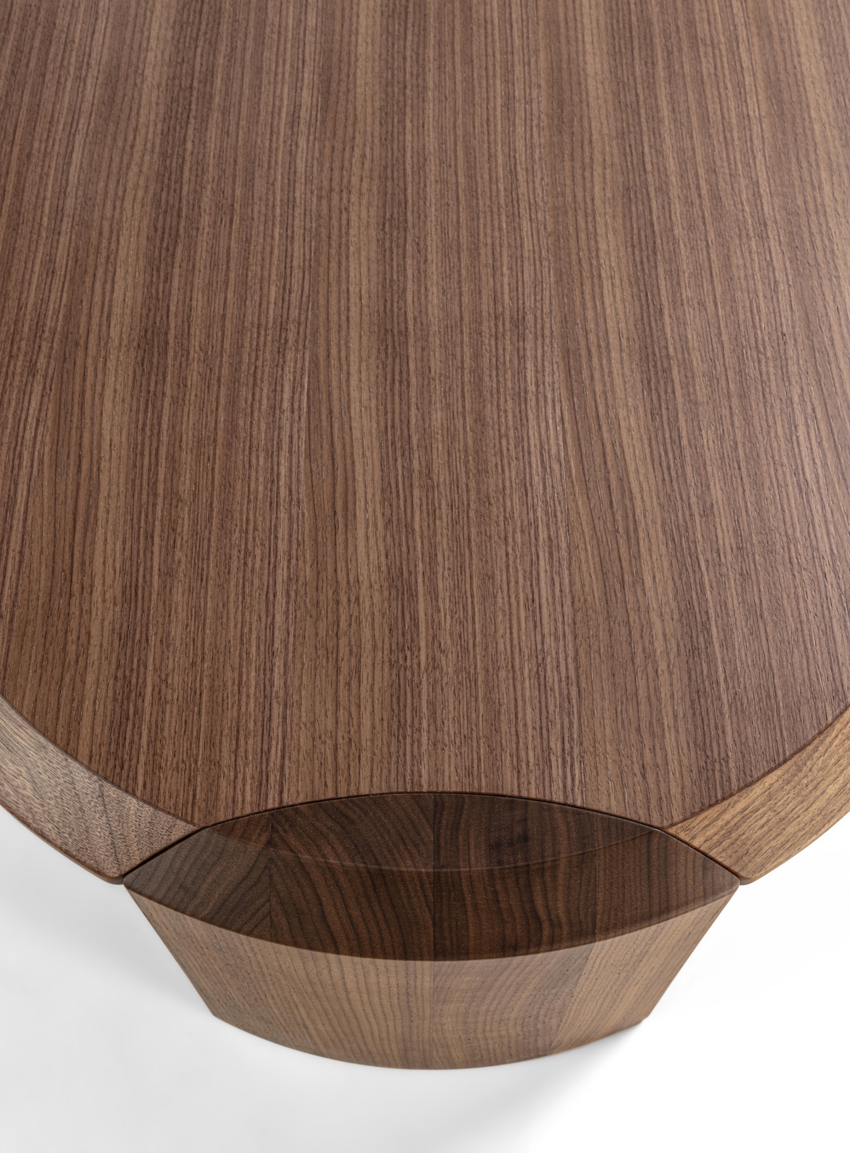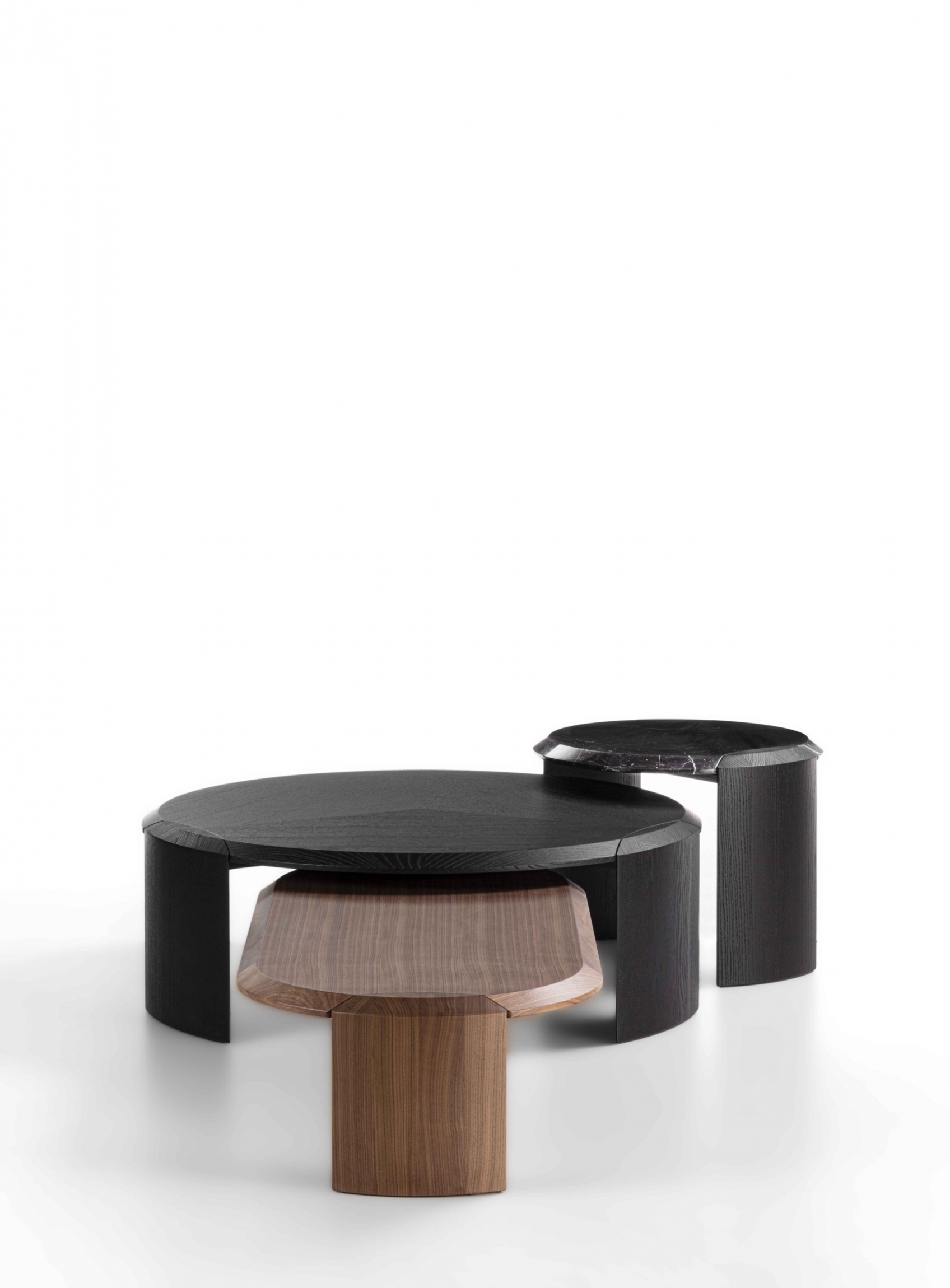 Family of nesting coffee tables of various shapes and finishes, characterized by an elegant joint between the wooden legs and the wooden or marble top.
