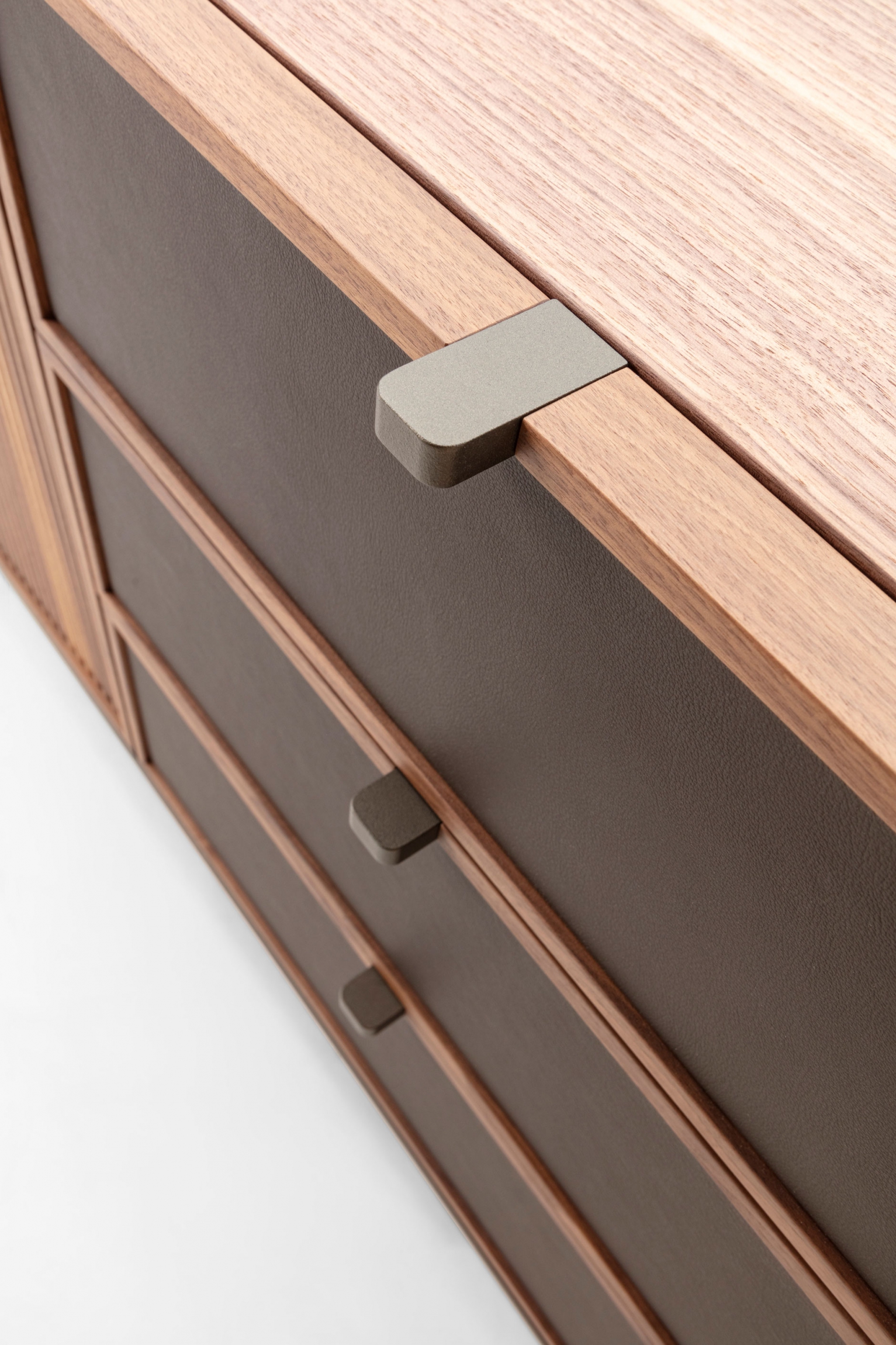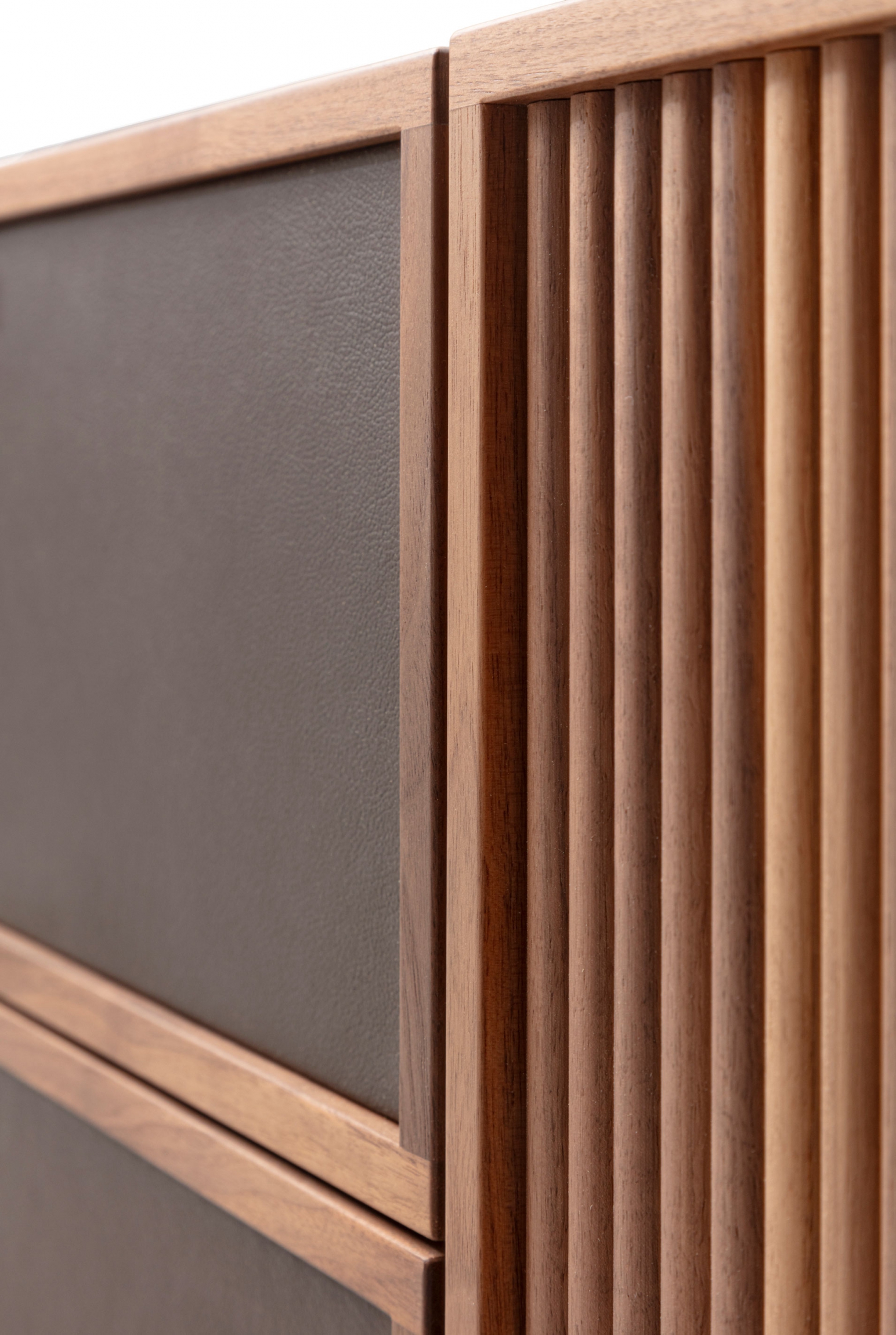 Wooden storage cabinet with metal base. The top is made of wood, and on the front you can see three doors characterized by a cannulated finish and three drawers with a front upholstered in leather, alternatively, can be four doors with a cannulated finish. The internal breakdown is made with wooden shelves.