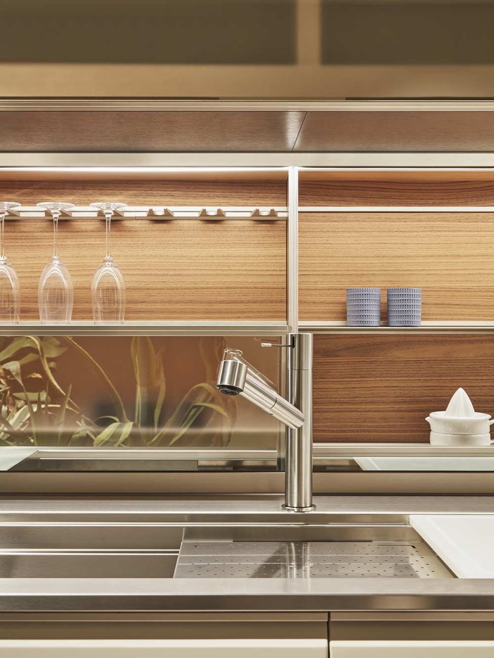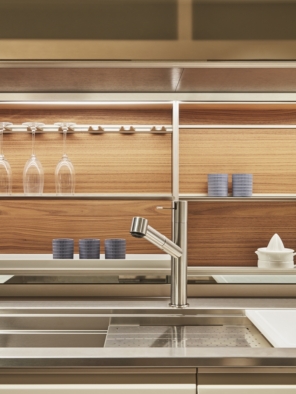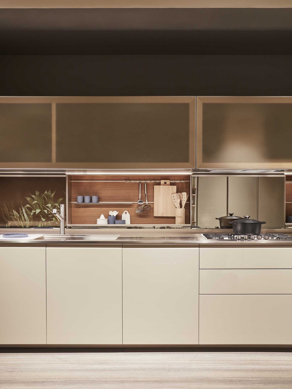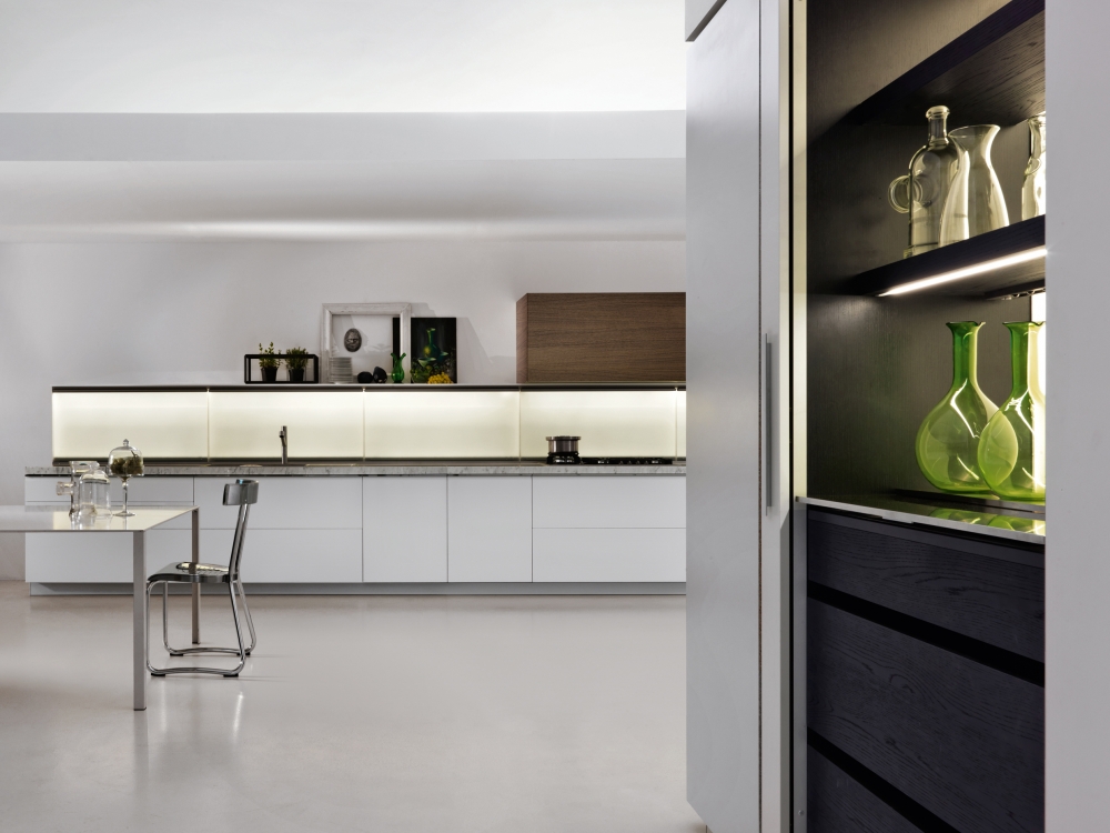 抽屜、柜門和懸拱是遠遠不夠的。 這就需要使用一種特殊的后方裝置,在懸拱和作業面之間形成可以放入Dada專利機制的一個空間以及滑動式隱藏的玻璃材料。 LED燈和電源插座有助于調節依靠核心科技為Trim系列安裝的背面。