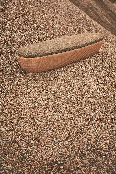Reminiscent of sunny summer afternoons and the slow passing of time. Afternoons is an outdoor lounge set featuring an armchair, sofa, bench and oval coffee table with a choice of top in Pietra Lavica Smaltata, Pietra Bianco or Grigio Pece. Supported by an outdoor painted aluminium frame upholstered with natural-coloured, hand-woven PVC, the chair collection is padded with cushions in quick-drying polyurethane foam that fit perfectly into the silhouette. The collection is completed by a pouffe with Polimex and polyurethane frame and upholstered with a water-repellent cloth.