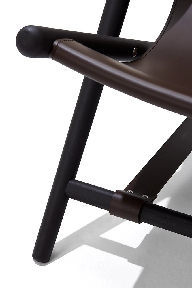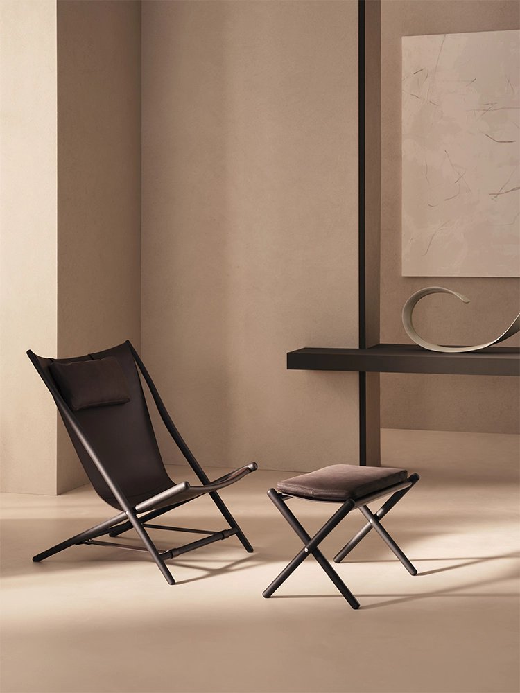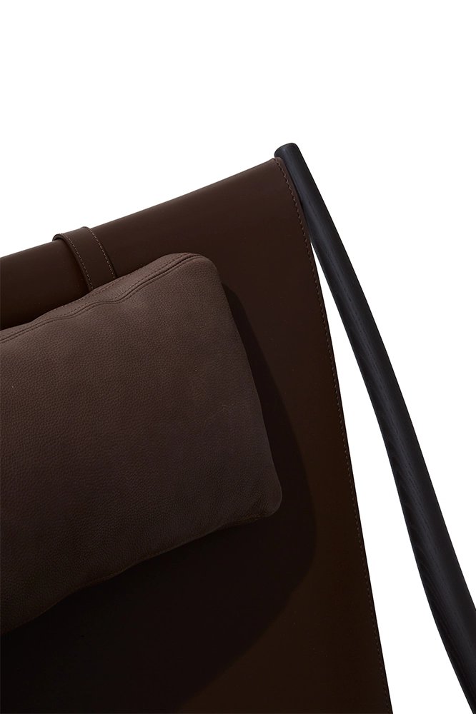 The narrative power of D’Antan tells an iconic story, seamlessly transitioning between the intricate details of matter and clean-cut lines. With impressive dimensions and a spacious seat, this armchair is supported by a solid dark ash frame upholstered in dark-brown leather, featuring a generous backrest that widens at the shoulders and a small leather cushion to support the head. The two curved crosspieces at the head and under the leg recesses offer an additional element of comfort, underscored by the footrest in the same finishes. Its light frame makes it easy to fold, facilitating its transport at will. The perfect synthesis of comfort.