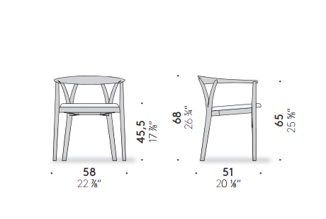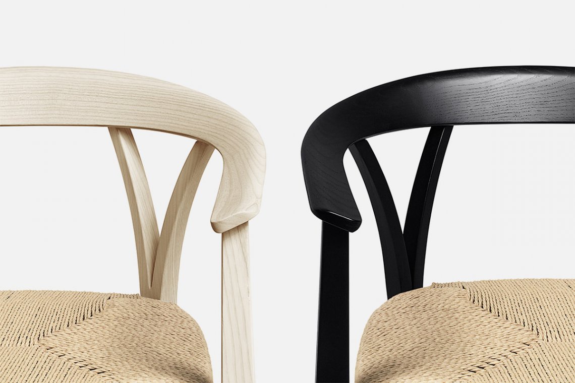 This chair by Michele De Lucchi echoes the lines of the more traditional Donzella. More agile and lighter, Donzelletta interprets the V motif of the original backrest by giving it a sleeker, more contemporary look. The structure is in solid bleached or black ash and the seat comes in woven straw or is covered in fabric or leather.