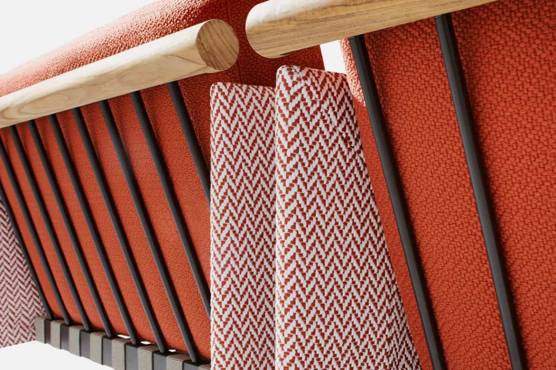 étiquette is a Scandinavian-inspired project that dialogues with superior Italian craftsmanship. Developed by design duo GamFratesi, the model includes a sofa, pouf and armchairs. The indoor piece lends itself perfectly to the outdoors thanks to a selection of finishes. The outdoor version features a body in matte black painted stainless steel that is complemented by elastic straps in a water-repellent fabric and a wood bar in natural teak. The atypical design is simple and essential, making it an excellent solution to mark out a space thanks to its unusual back view. The mood is completed thanks to functional aesthetic elements and refined combinations of precious and resistant yarns in neutral hues. étiquette Outdoor is paired with the Fezzan carpet, which is in Olyna, a recyclable, non-toxic and hypoallergenic water-resistant material that recalls the same natural tones of the armchair, pouf and sofa.
