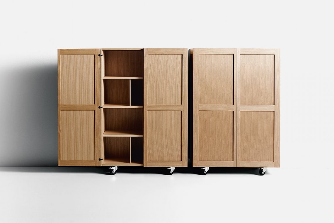 Contemporary and minimalist yet extremely solid. The Shigeto sideboard designed by Vico Magistretti has a solid natural oak structure on chromed swivel wheels. Square and geometric, it organizes the glassware and dishware at home with shelves and dividers that are also perfect when on display, combining practicality, versatility and discreet elegance.