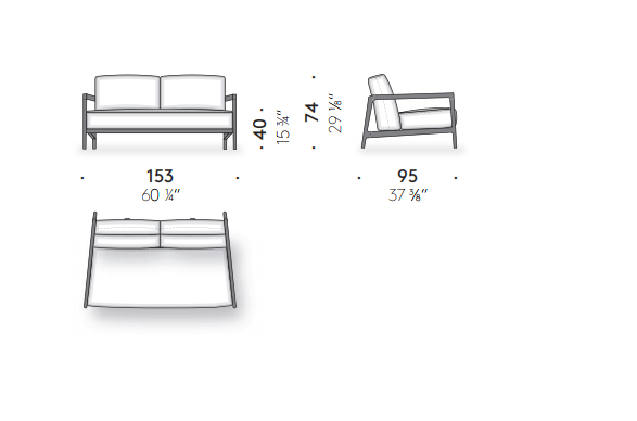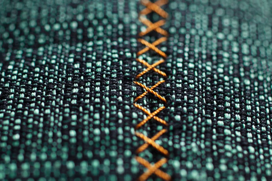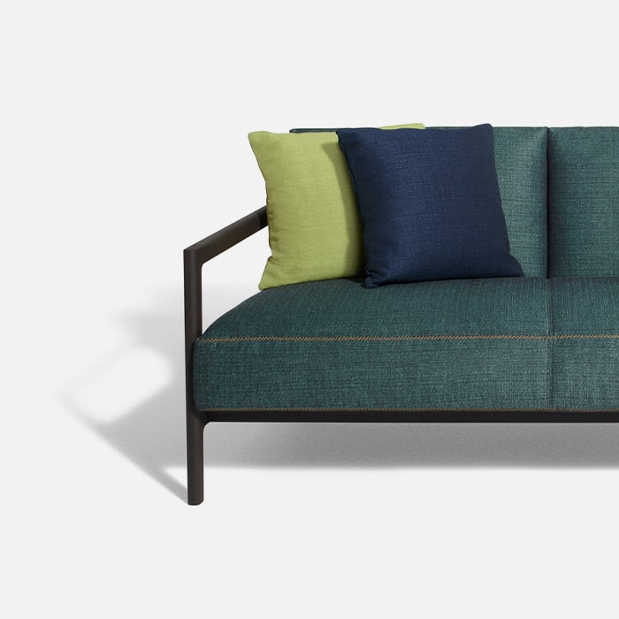 Sofas, armchairs and pouf are marked by contrasting stitching that evoke sartorial know-how.