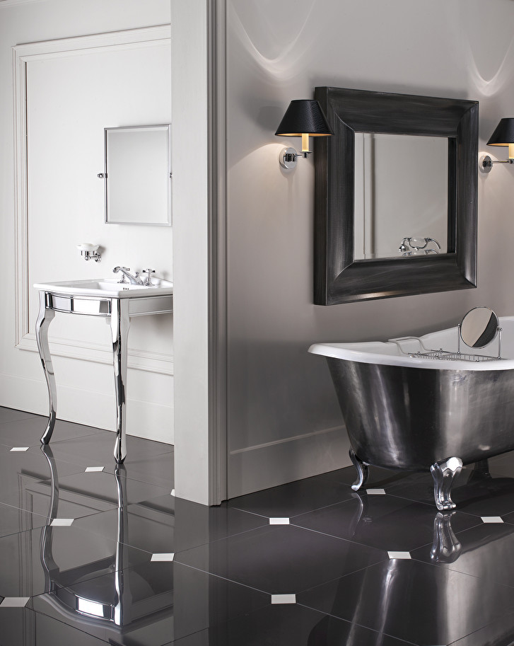 This console reinterprets the eighteenth-century inspiration focusing on the need of contemporary living. Thanks to its small sizes it can also be placed in small rooms, giving them great charm. The bearing structure in fused aluminium is available in light gold, chrome or polished nickel finishes. It is completed with Westminster porcelain basin.