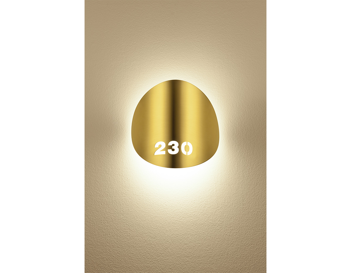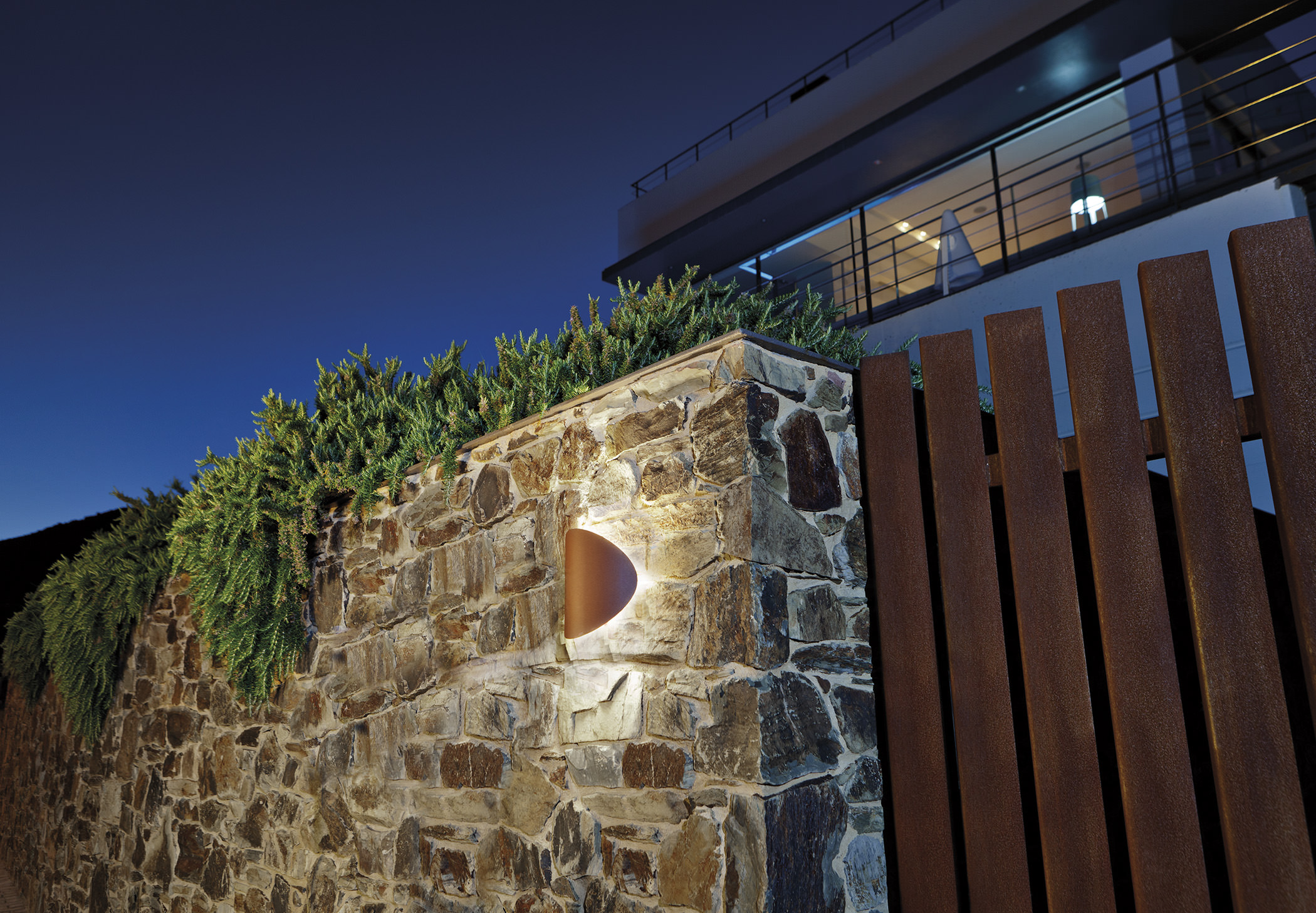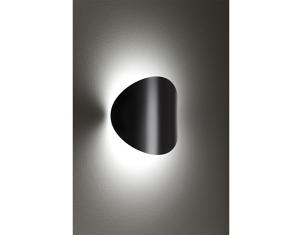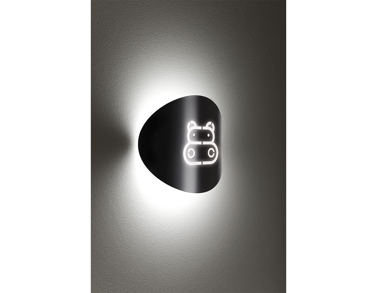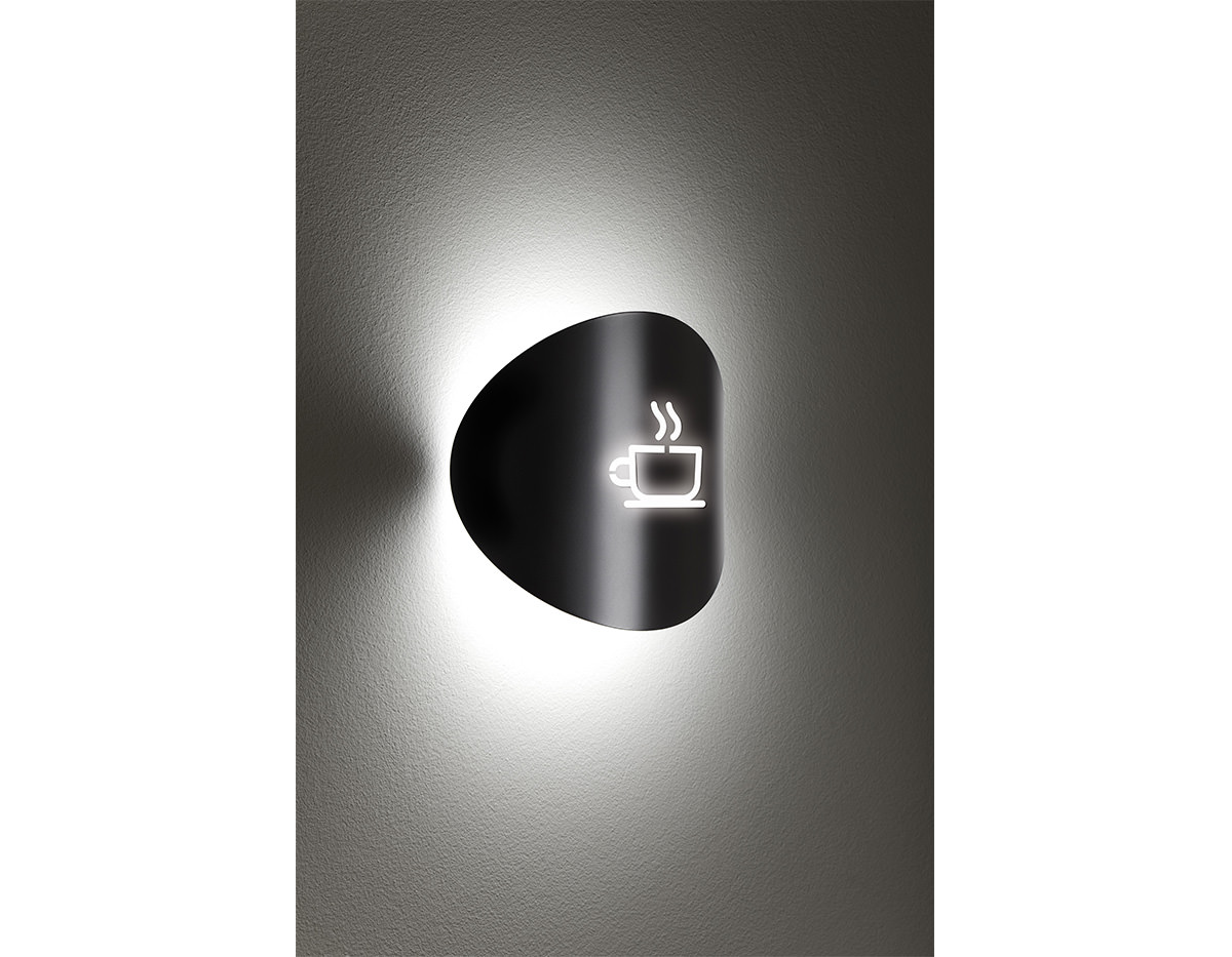 Metal wall lamp suitable for indoor and outdoor with an interior shade made of polyethylene and integrated dimmable LED. The curved metal front plate allows laser-cut signage with custom creations including ideograms, logos and texts.
