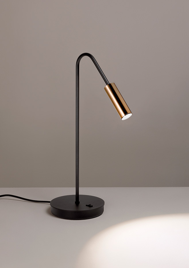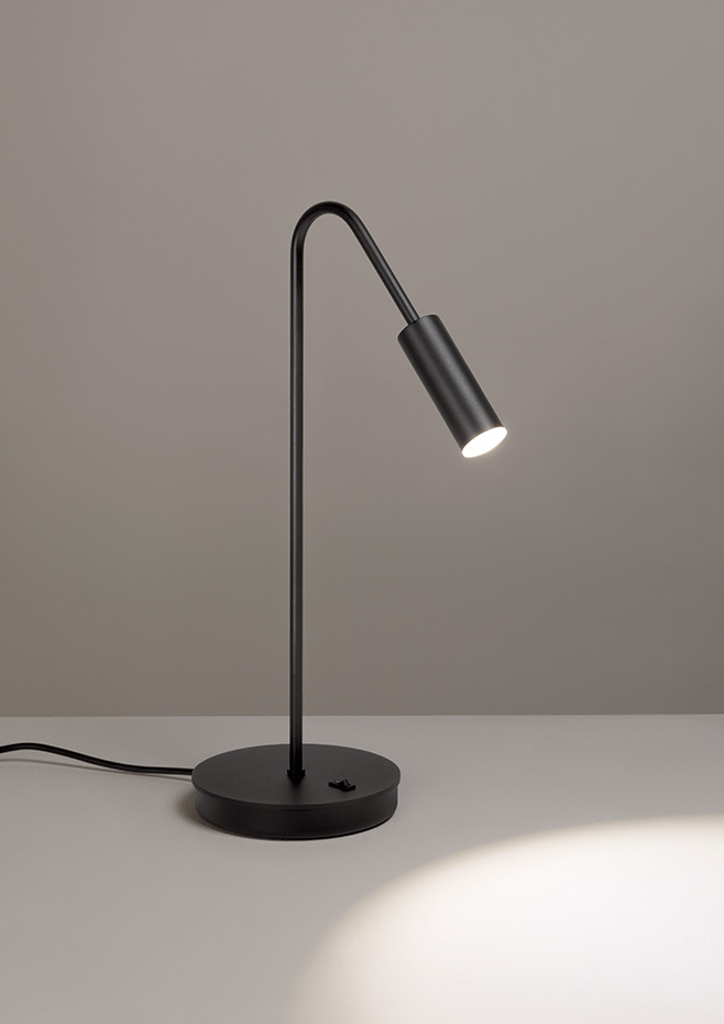 Table lamp with a cylindrical aluminium head, acrylic (PMMA) lens diffuser and integrated LED. On/off switch.
