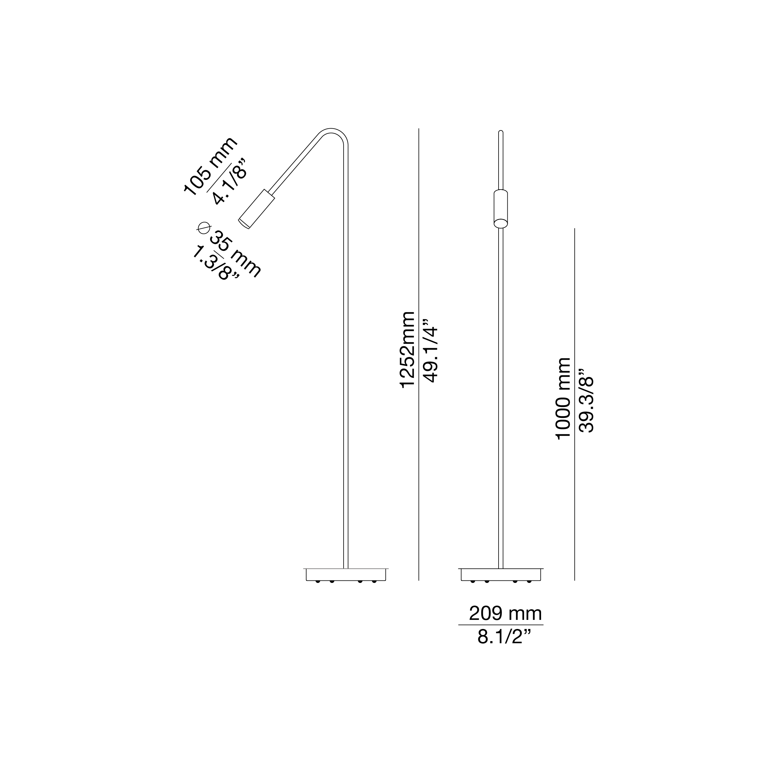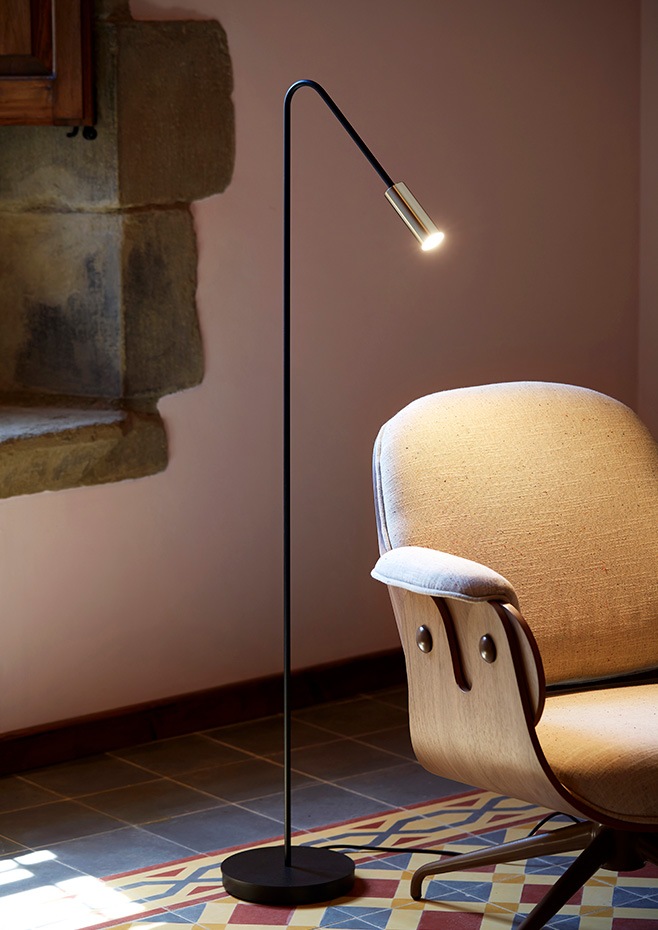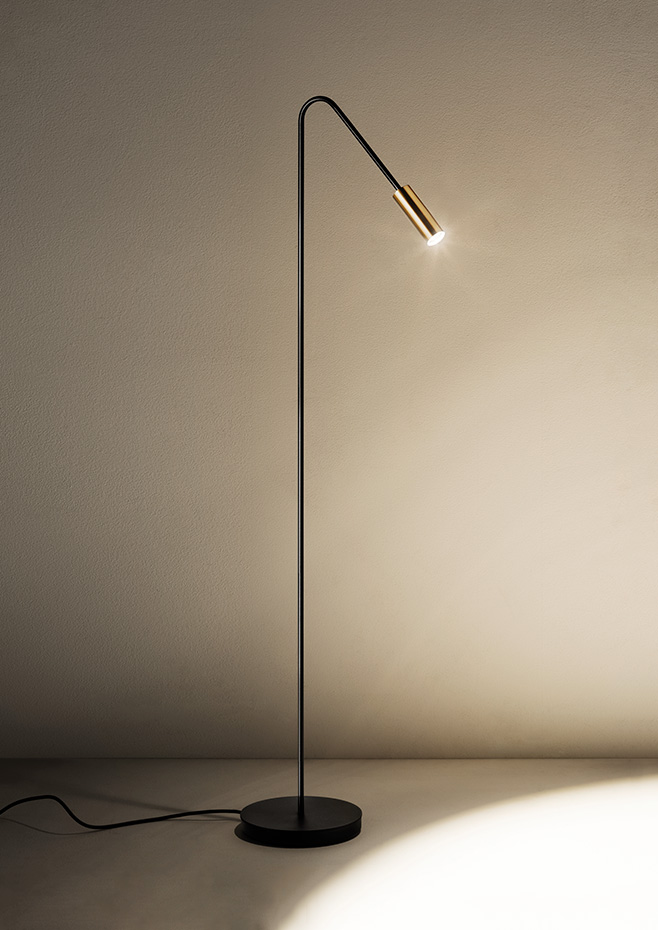 Floor lamp with a cylindrical aluminium head, acrylic (PMMA) lens diffuser and integrated LED. It incorporates a push button in the head that allows regulating the intensity of the light.