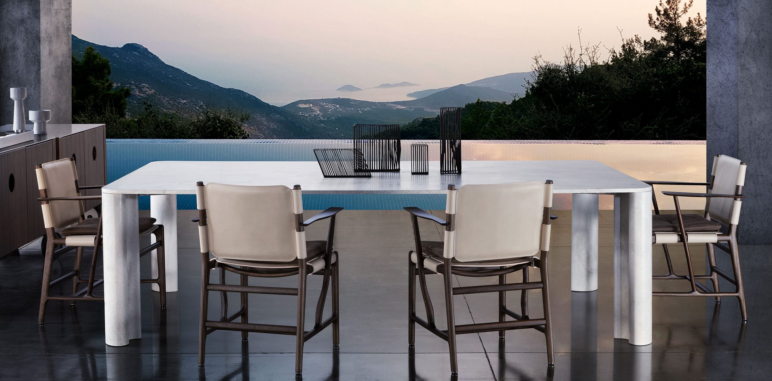 Together, the table’s natural marble veins and sinuous leg lines form a timeless outdoor element.