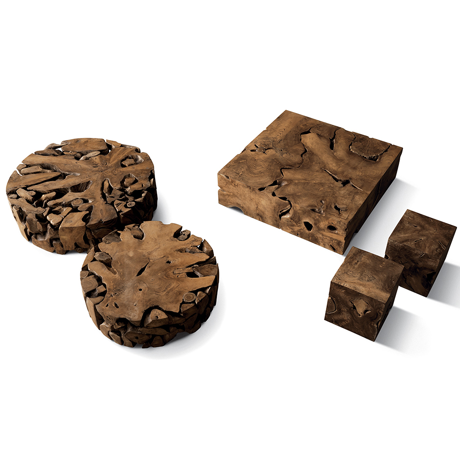 Handcrafted entirely of teak root with dark golden-yellow and brown hues, this striking coffee table represents the pure artistic essence of nature. The timber root, sanded down and polished with wax, creates unique geometrical shapes that contrast with the irregularity of the interior grain. A one-of-a-kind by nature, this striking coffee table can be combined in sets of different sizes to complement any style of furniture, effortlessly playing on the contrast between the fluid lines of the wood and the organic shape of the root.