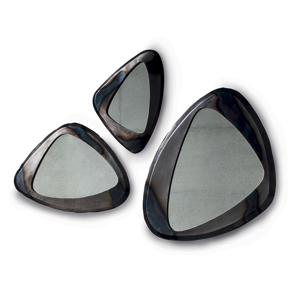 Questo tris di specchi è adatto ad esempio ad un moderno ingresso, un soggiorno o uno studio privato. La particolare forma di TERNO esprime un'avvolgente movimento attraverso la lamiera modellata dai delicati bordi triangolari morbidi e stondati. La finitura specchiata è ottenuta tramite l'utilizzo di fiamma ossidrica, un metodo di lavorazione artigianale distintivo, che eleva il valore artistico di questo pezzo. Sono inoltre disponibili tutte le varianti di finiture metalliche satinate e diamantate come il nickel, il bronzo, l'ottone e il piombo oltre al ferro fiamma ossidrica e il verderame satinato.
