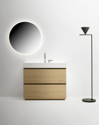 Mobile bagno porta lavabo con cassetto, top integrato e lavabo da appoggio, dimensioni da 140cm a 160cm. Piano integrato in Fenix con taglio a 45°. Lavabo in Cristalplant? Bio Active opaco modello Ciotola con copri piletta in Cristalplant? Bio Active, disponibile nelle versioni centrato, a destra e a sinistra del mobile. Basi del mobile con frontali e fianchi a 45°. I cassetti sono completamente estraibili e sono disponibili con maniglie opzionali a gola o premi apri.