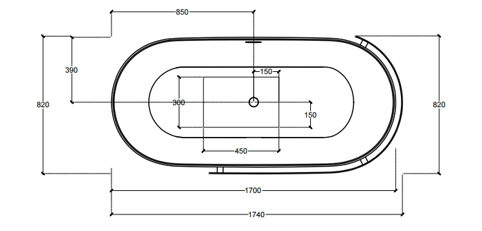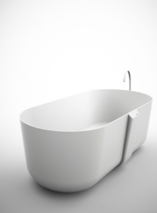 Vasca da bagno freestanding centrostanza in Cristalplant con dimensioni 174cm per 82cm. Porta salviette e bordo inferiore del basamento in metallo. Copri piletta in Cristalplant.