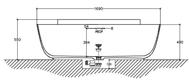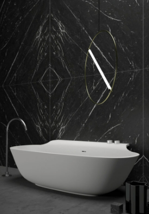 Vasca da bagno freestanding centrostanza in Cristalplant con dimensioni 174cm per 82cm. Porta salviette e bordo inferiore del basamento in metallo. Copri piletta in Cristalplant.