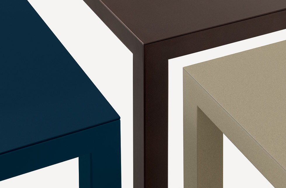 Non-toxic powder coating for interior use, with no heavy metals. Cured in an oven at 190°C, following degreasing and phos-phating. Guaranteed minimum thickness of 50 microns. Minimum resistance to salt spray of 200 hours (in accordance with the ASTM B117 standard). Some finishes are suitable for direct contact with food as re-quired by Italian Law Decree D.M. 21/03/73 and subsequent updates. Before the coating is added, it is possible to assess whether to give the products a special treatment to make them more resistant to wear and exposure to the elements. There is a surcharge for this treatment. Requests for