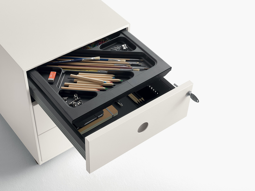 Mya è una cassettiera scorrevole e silenziosa, grazie alla qualità dei materiali e all’utilizzo delle migliori guide a sfere. Progettata per ridurre al minimo le dimensioni esterne – a parità di capacità di contenimento dei cassetti – si caratterizza per la pratica maniglia ad incasso dal diametro di 4 cm.