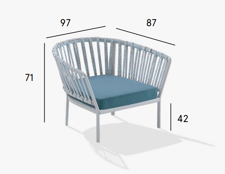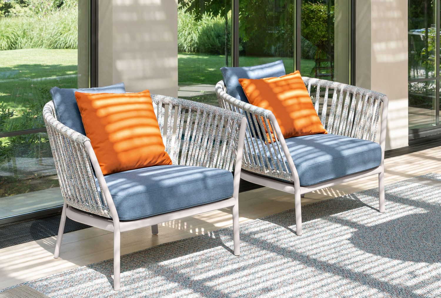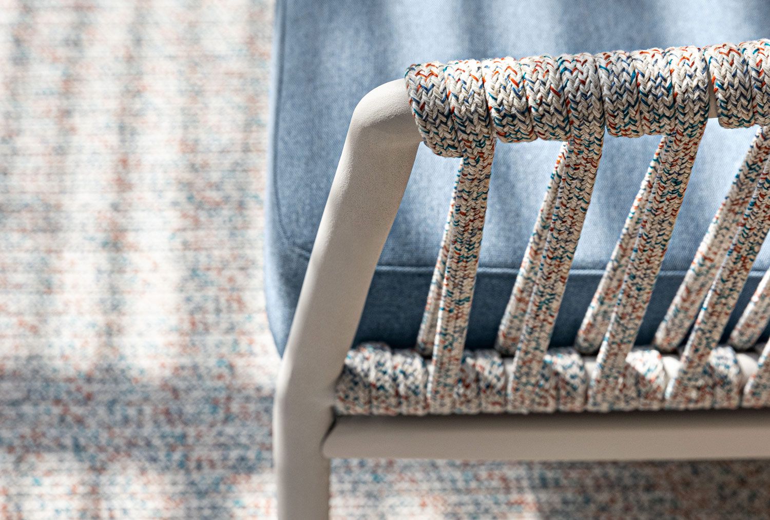 The Ria collection includes: dining armchair in the aluminium, partially woven rope, fully woven rope and with quilted backrest versions, 2/3-seater sofas, armchair, lounge chair and daybed in the woven rope versions.