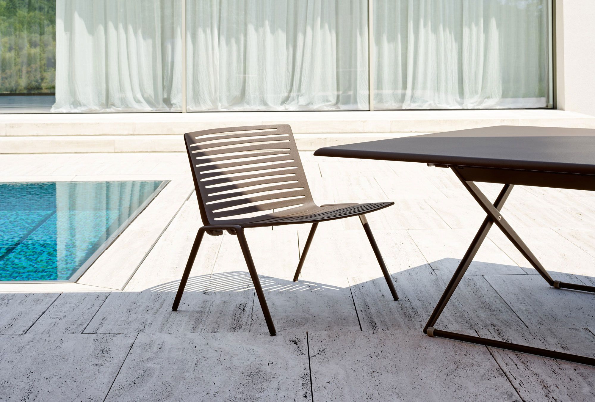 The encounter between the solidity of the material and the light weight of the shapes. In the Zebra collection, the die cast aluminium is structured by removal, which with a game of blocks and voids, illuminated by the sun, designs mesmerising geometric shapes on the ground. For even greater comfort, cushions are available for the seat and backrest, covered with fabrics which are suitable for outdoor use: resistant to water, to stains, to UV rays, and to abrasions.
