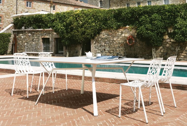 The characteristic shape of the legs of this aluminium outdoor table was inspired by the mathematical sign of the square root (Radice Quadra in Italian). The frame – which is light-weight and geometrical, in die cast aluminium – is completed either by a square, rectangular or round table top in aluminium or in speckled aluminium. The Radice Quadra tables match all the seats in the Fast collection, but a particularly sophisticated contrast is achieved if you team them with the graphic appeal of the Forest collection.