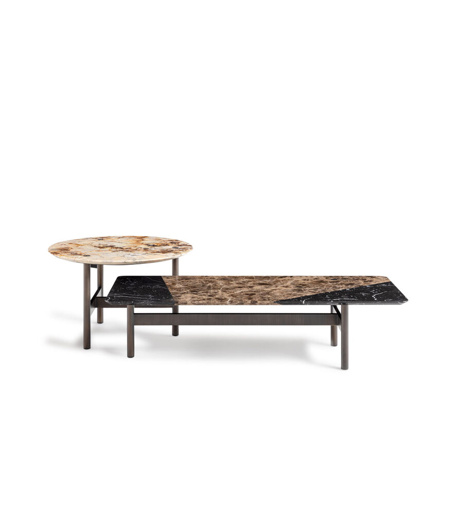 Designed by Toan Nguyen, this low table is part of the Totu project, incorporating all its distinctive characteristics. The geometric interlocking levels are enriched by a refined combination of marbles, arranged to recreate the archival Astuccio pattern. The tubular metal legs, enriched with FF detailing, link to the top of the piece to create a stylistic continuum that's typical of the design project.