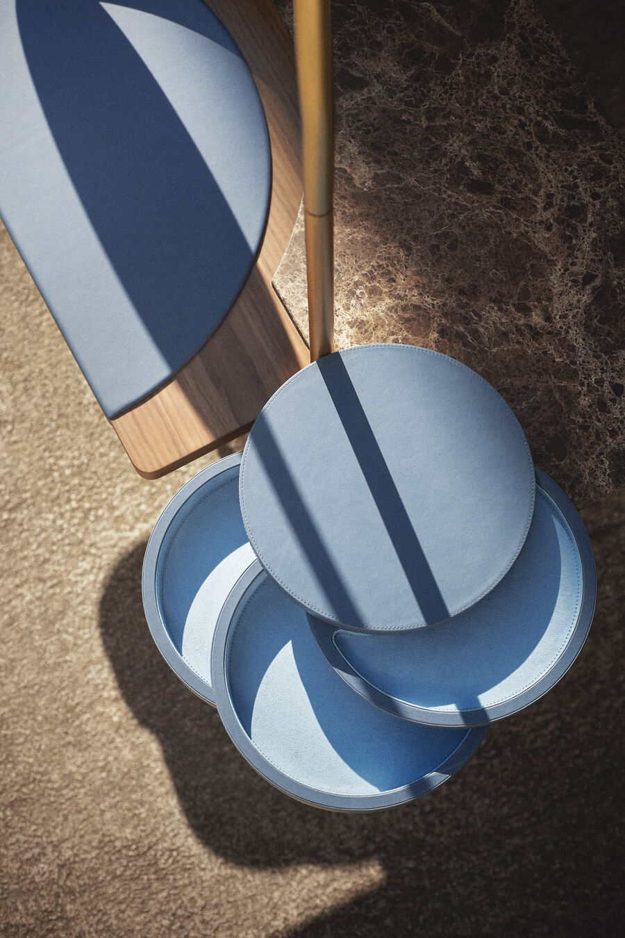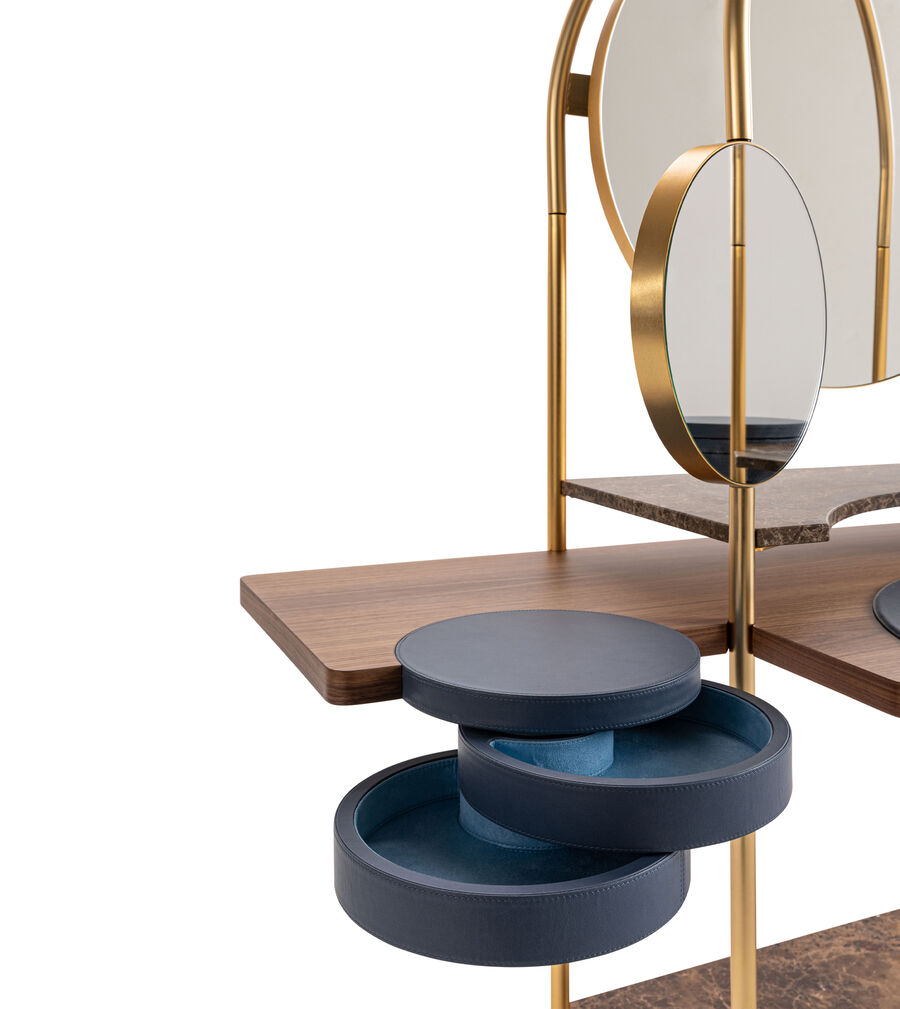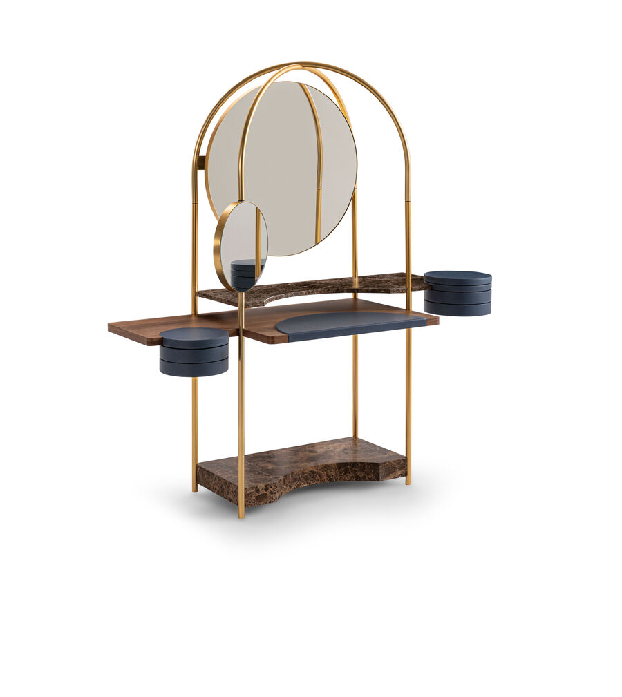 The Vanitoso dressing table, designed by Atelier O?, is a stylish homage to femininity. The steel structure and duo of round mirrors create an intriguing interplay of light reflections, unusual geometric forms and sinuous lines. The base and top in honed marble create a sophisticated tactile contrast with the shelf in American walnut or oak while leather detailing adds an elegant touch of the distinctive colour that has long been synonymous with Fendi creations.