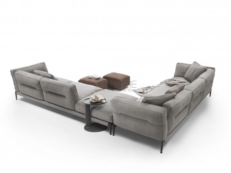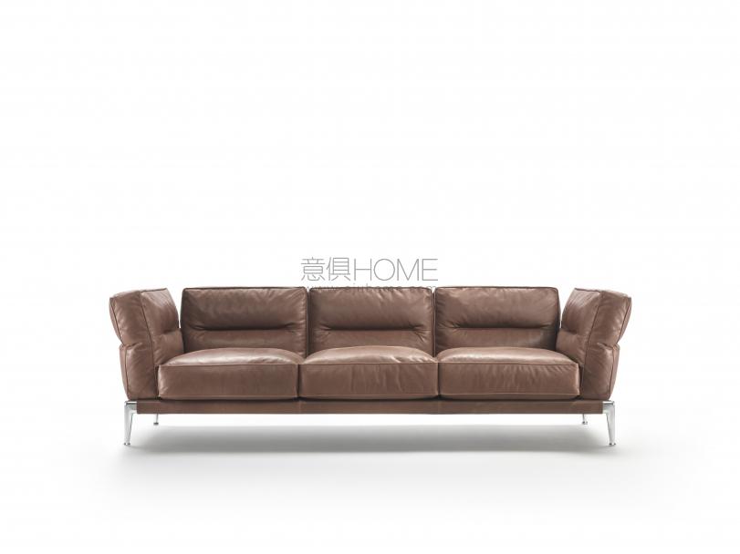 柔軟的扶手墊與靠墊通過簡單有效的滑扣系統安裝在底座上。 靠墊中央有一道獨特的橫向縫線鎖緊, 在真皮或織物面料產生了輕微的紋路, 不僅遵循人體倚靠靠背時的自然曲線, 更為沙發賦予了與眾不同的特點。