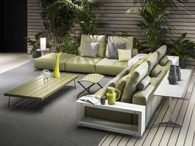 Grandemare戶外座椅系統具有模塊化的特點,可鼓勵各種可能的布置方式,并且可以搭配由實心iroko板條和光滑的金屬合金墊片制成的同名咖啡桌。