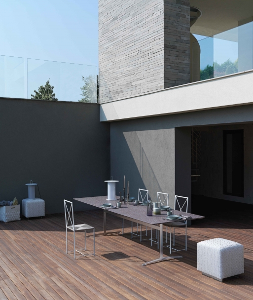 The extensive family of extremely versatile Fly tables and side tables is now expanded with the addition of a custom-crafted version designed for outdoor use. Purity of design, along with true practicality and the variety of finishes and sizes available lend the Fly Outdoor table exceptional decor flexibility. The base of the Fly Outdoor table is in austenitic stainless steel 316, also available with epoxy powder-coated white, khaki green, wine red or burnished finish. The top – available in round and rectangular shapes and various sizes – can be made of different types of stone suitable for outdoor use: Beola argentata (silvery green gneiss), lava stone, pietra del Cardoso and porphyry. The rectangular table also comes in a version with solid natural finish iroko slats or stained white or grey. It is strongly advised that the respective covers be used to keep the Fly Outdoor tables in top condition and prolong their original beauty as much as possible.