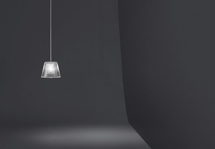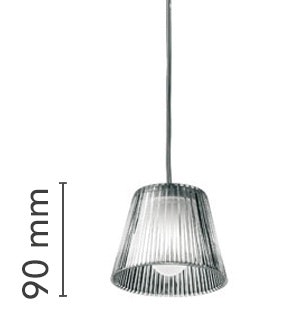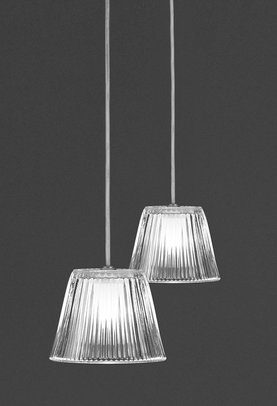 Suspension lamp providing diffused light. Acid-etched pressed borosilicate glass internal diffuser. Pressed clear glass shade. Gray painted die-cast aluminum diffuser support.