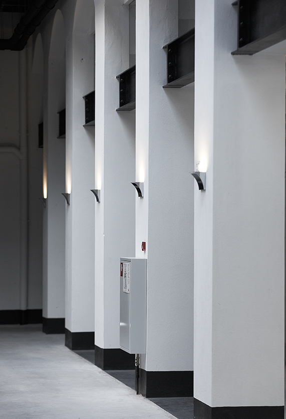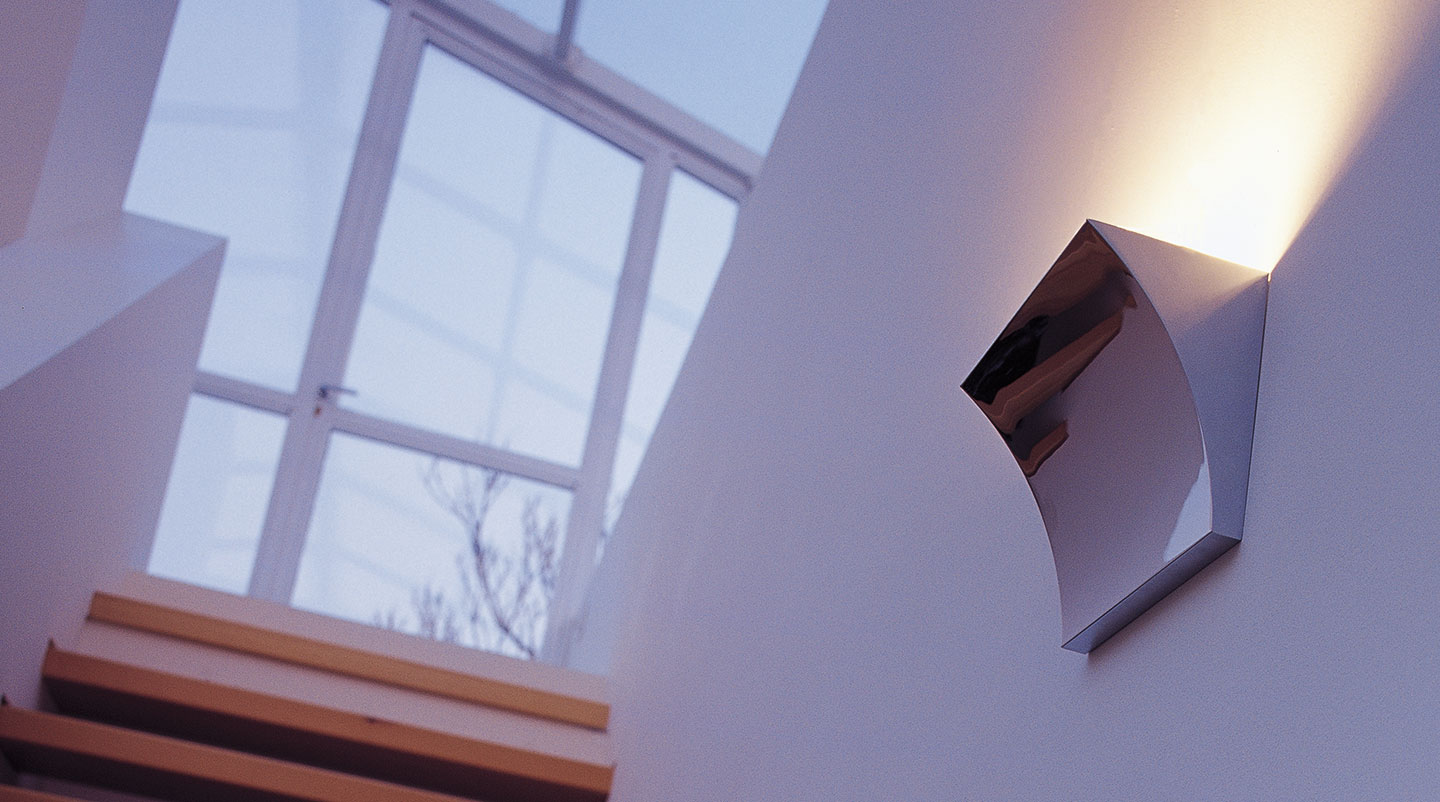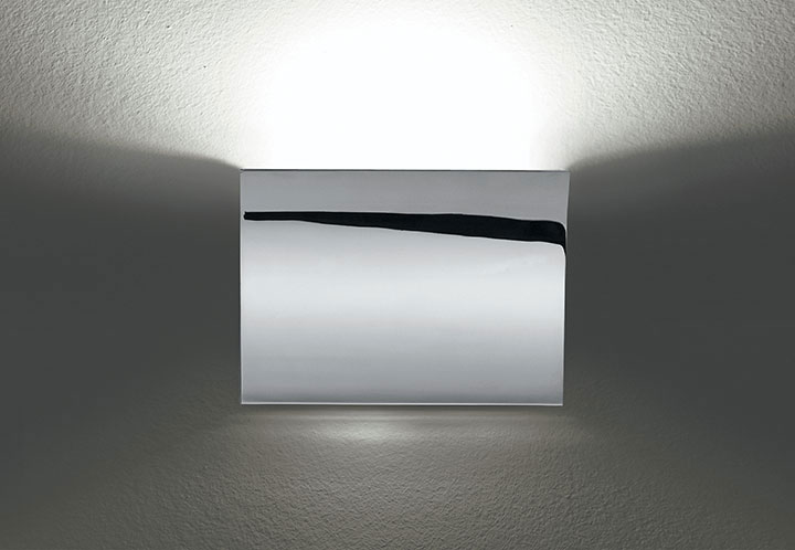 Wall lamp providing indirect light. Pressure die-cast Zamak alloy structure. Molded steel, galvanized white wall attachment containing the wall attachment system as well as the electrical devices. Pochette has a single dimmable light source in the traditional recessed series.