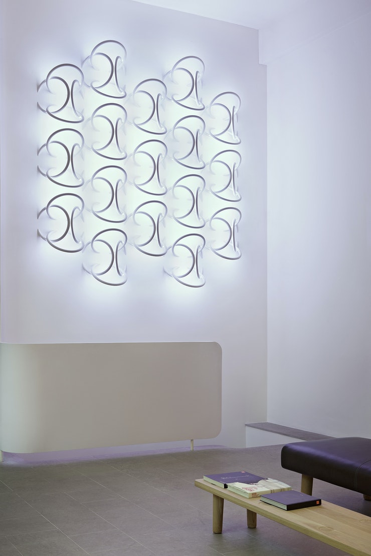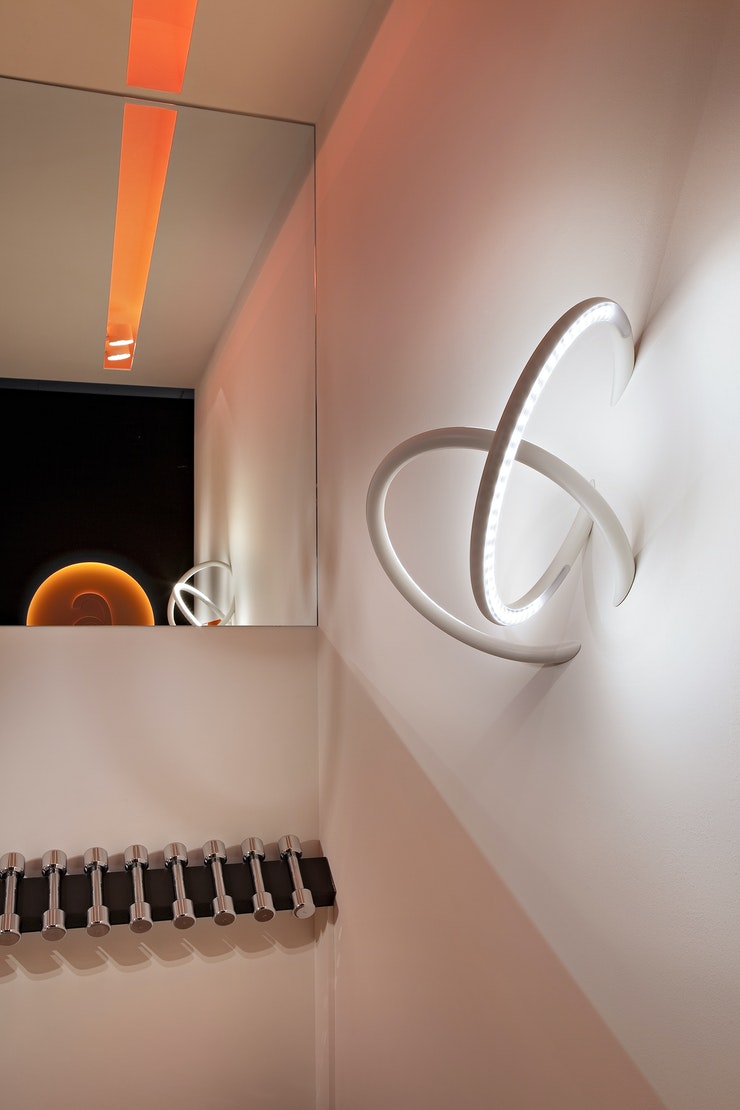 LED wall lamp designed for minimal visual impact integrated into wall. Flush-mounted on plasterboard wall. Aluminium ring with polycarbonate diffuser. Fast electrical installation with female connectors and plastic hooks for easy installation.