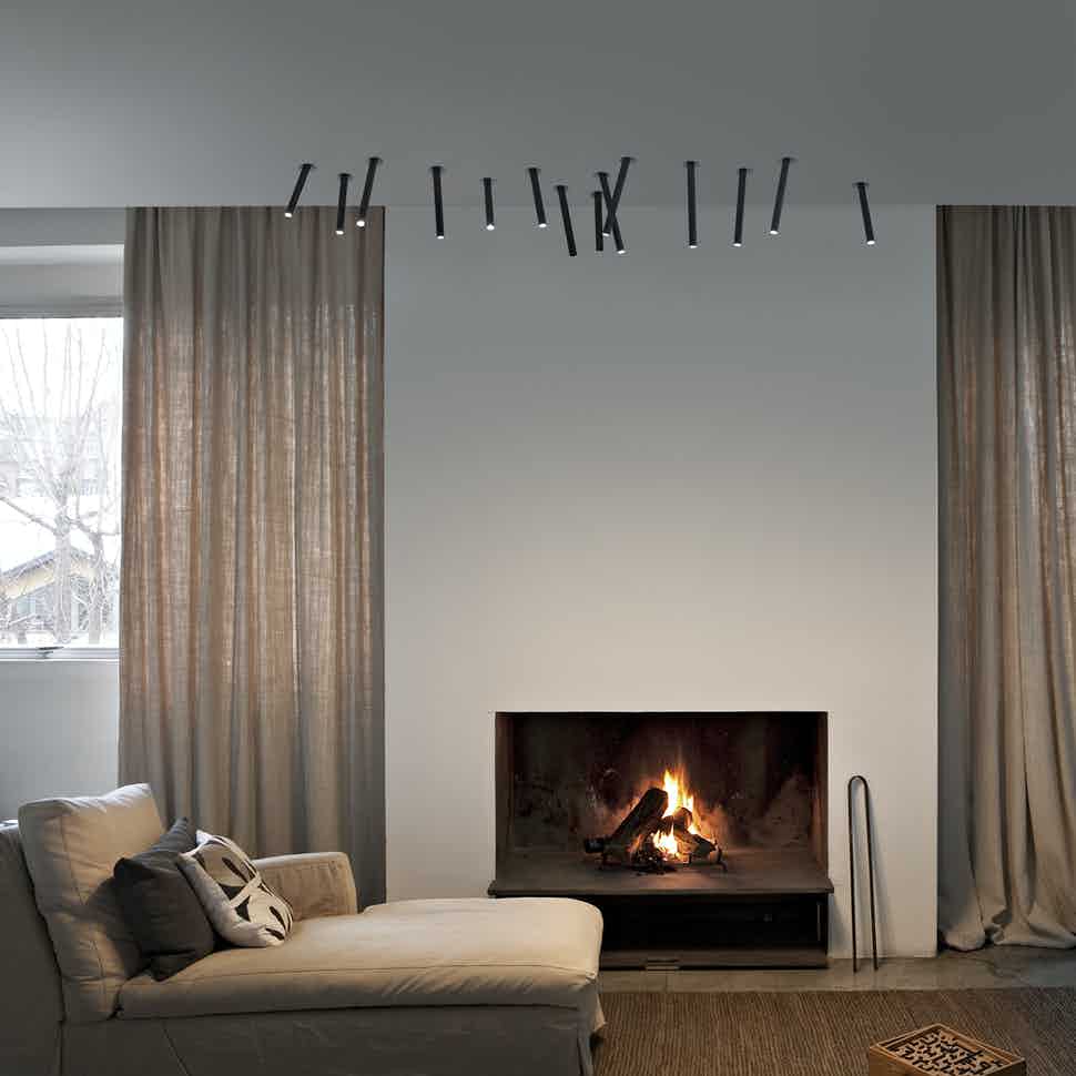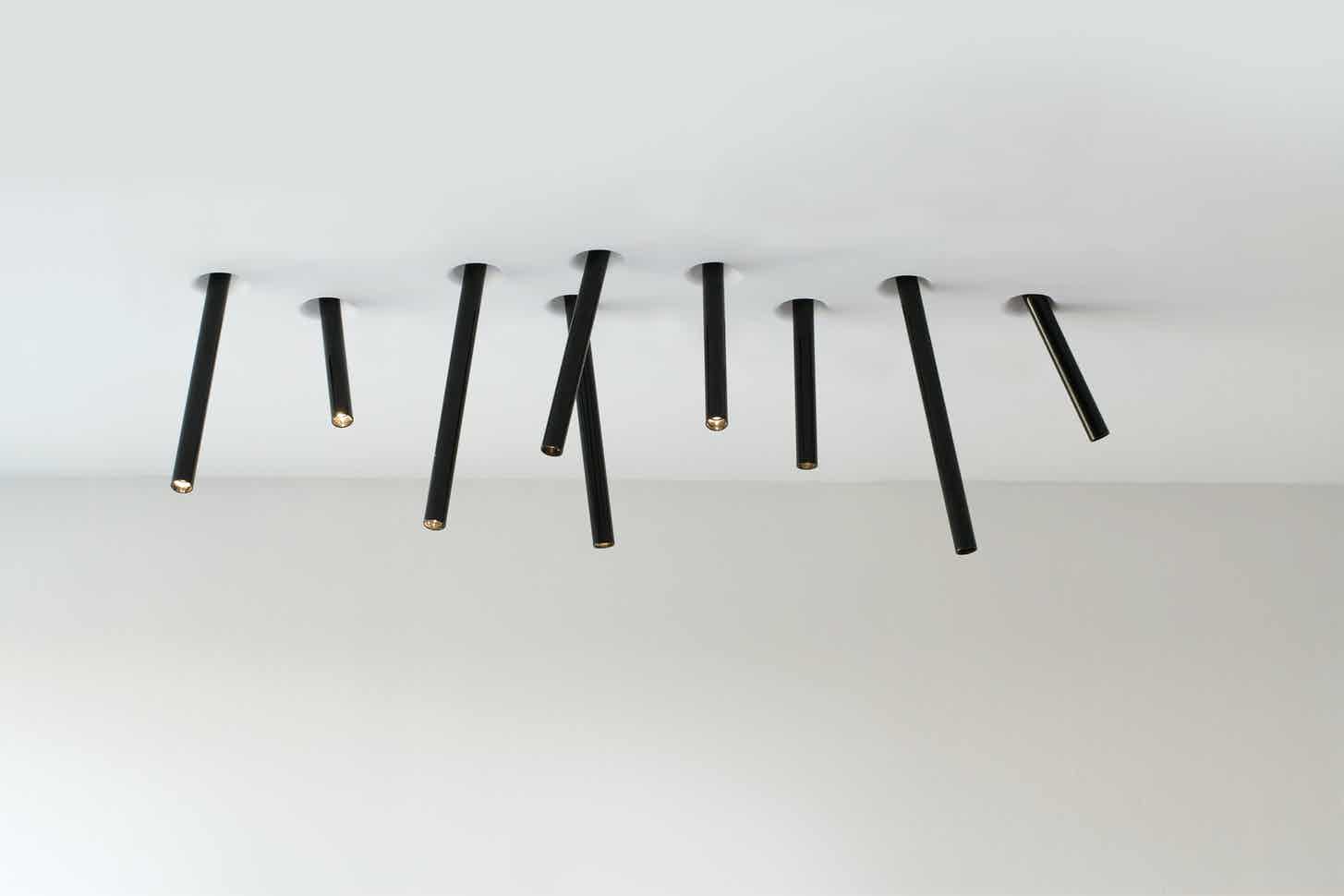 Luminaire inspired by “bunches of reeds” hovering over the water surface. With a high power LED, the tube can be tilted and inserted or removed from the ceiling to direct the beam of light and create the desired artistic composition.