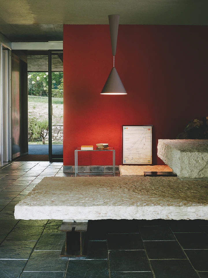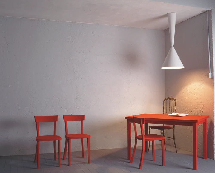 Designed by A. Castiglioni, Diabolo is a pendant light with direct lighting composed of a ceiling rose and diffuser. Body in aluminum.
