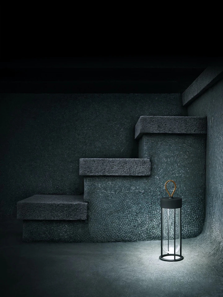 Outdoor wireless, rechargeable table lamp providing diffuse light via an integrated LED source that guarantees a uniform glow.