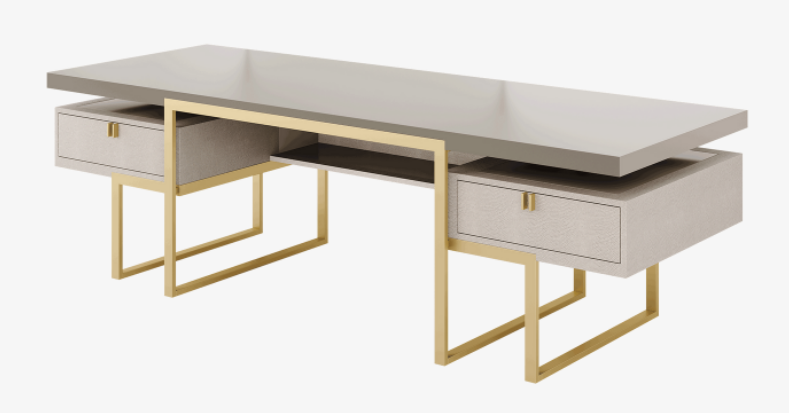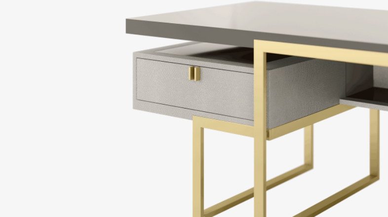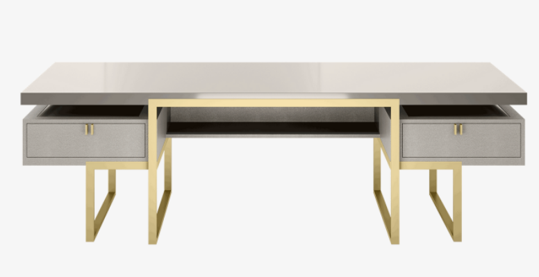 Conceived so that it can be placed at the centre of a workspace, the impressive ALLURE desk is designed to look good from every angle. A mix of lacquered wood and brushed brass, the design's ample work surface and twin leather-fronted drawers prioritise productivity.
