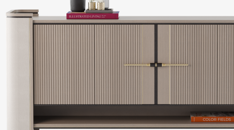 Fluted double doors, leather-covered sides, seams of brushed brass, an open shelf and a sculptural handle - there are a lot of small details to take in when it comes to the BUENOS AIRES sideboard, and yet the overall impression is perfectly streamlined and practical.