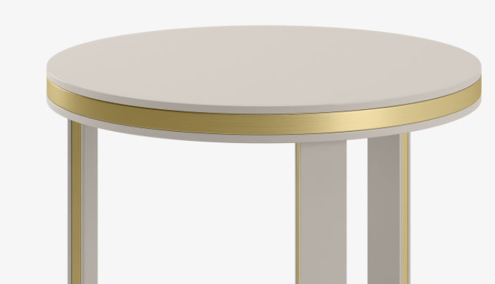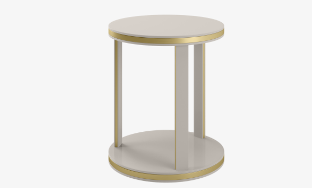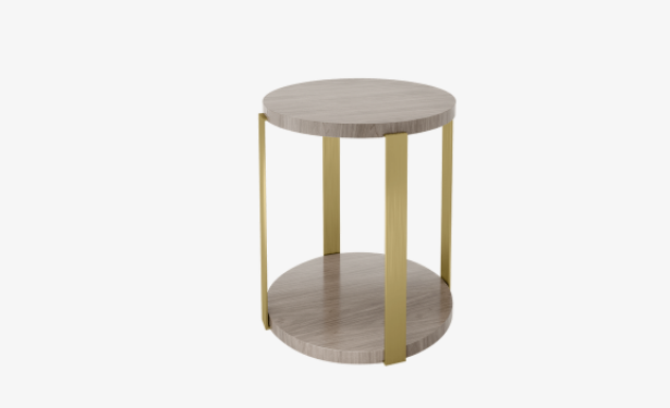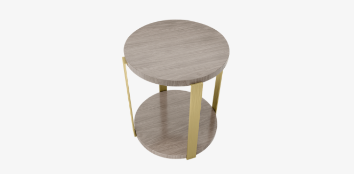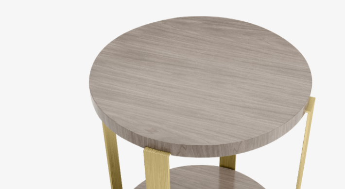 Consisting of two circles of glossy wood veneer supported by four strips of brushed brass, the BENIM side table is at once simple and striking. Place everyday items on top, and less frequently used items below