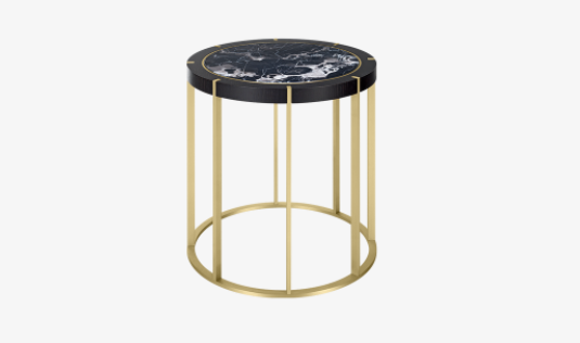 The drum-shaped design of the PRAGUE side table features a circular metal base and eight slimline legs. These slice though the outer edges of the surface, which features a stone centre surrounded by rings of metal and wood veneer.