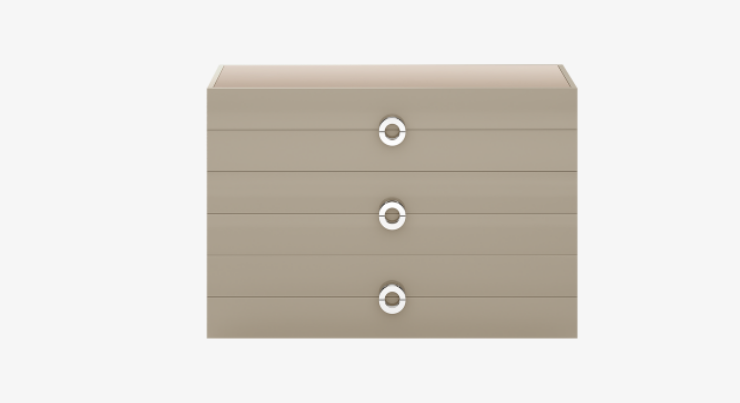 Part of a three-piece bedroom collection, the box-shaped SOHO chest of drawers is seamlessly crafted from glossy lacquered wood. Adding flair to its simple silhouette are distinctive O-shaped handles in polished metal and a surface of bronze mirror.