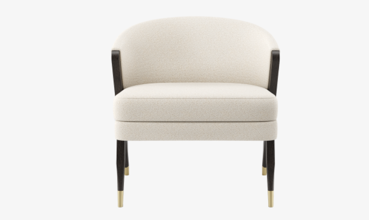 Pristine white upholstery emphasises the dark wood veneer frame of the CARMEL armchair, highlighting the way the armrest flows seamlessly into the leg line.
